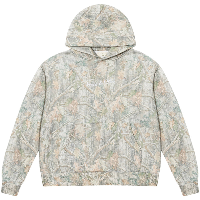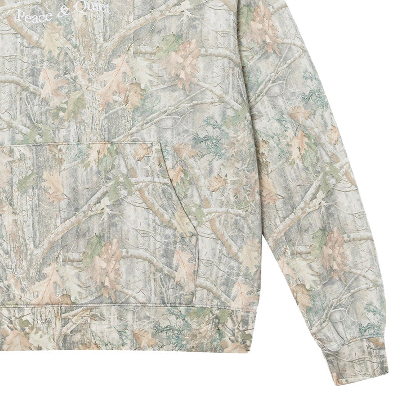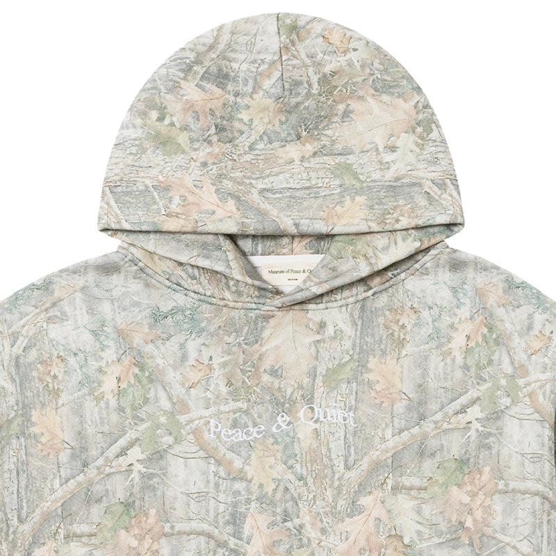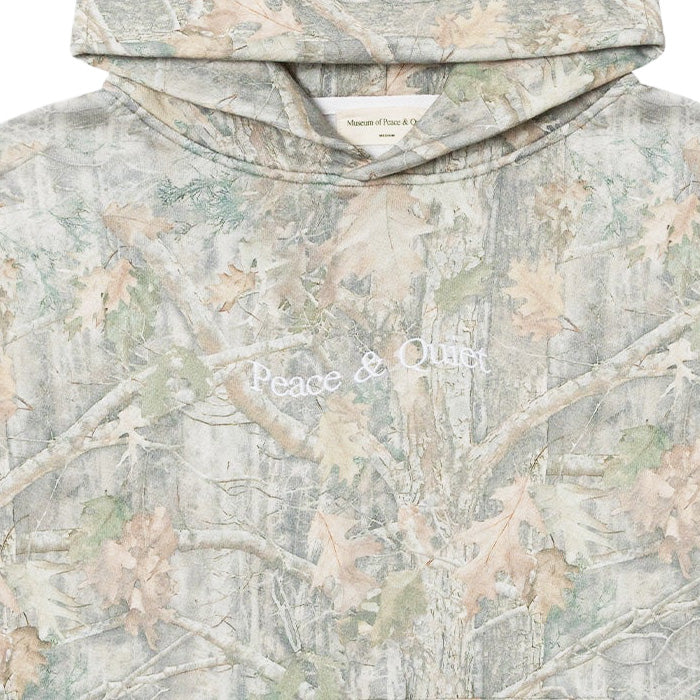 The Museum of Peace & Quiet Wordmark Camo Distressed hoodie in Camouflage is a high-quality, heavyweight, and super soft sweatshirt that features an allover seasonal faded realtree camo pattern as well as an embroidered 'Peace & Quiet' word mark logo on the chest in White. It is heavyweight but has a soft and lightweight feel due to the flush loopback construction of the Cotton two-end French Terry fleece it is made with. Additional features include a front kangaroo pouch pocket and a relaxed fit. 100% Cotton.