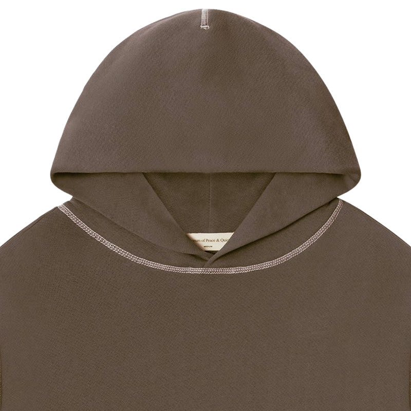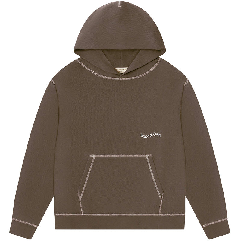 The Museum of Peace & Quiet Wordmark Reverse Stitched hoodie in Brown is a high-quality, heavyweight, and super soft sweatshirt that features an embroidered 'Peace & Quiet' word mark logo on the front left side in White. It also features contrasting White overlock stitching throughout for a unique look. It is heavyweight but has a soft and lightweight feel due to the flush loopback construction of its Cotton two-end French Terry fleece. Additional features include a front kangaroo pouch pocket and a relaxed fit. 100% Cotton.