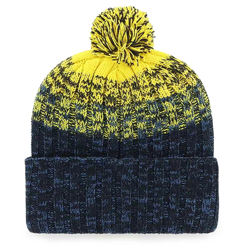 The University of Michigan Wolverines Cascade cuff knit hat beanie in Navy from '47 is a high-quality marled knit beanie with a fade design from Yellow to Navy vertically down the hat. It also features an embroidered Michigan Block M logo in Maize on the front ribbed cuff of the hat, a tiny '47 woven logo tag on the left side of the cuff, and a Yellow and Navy pom at the top of the hat. 100% Acrylic.