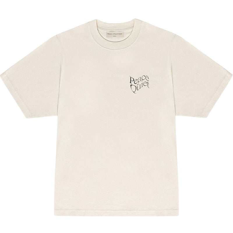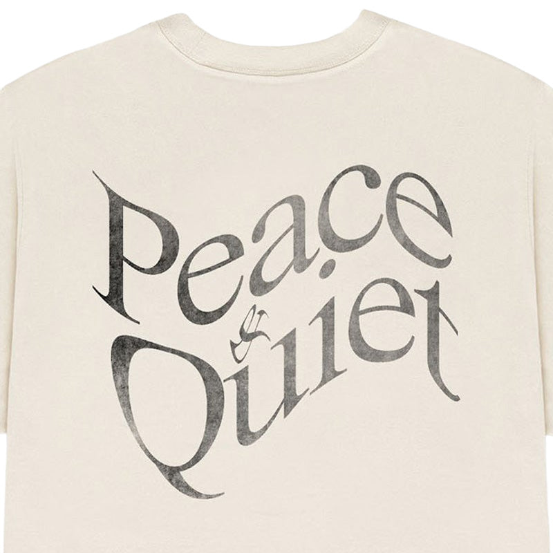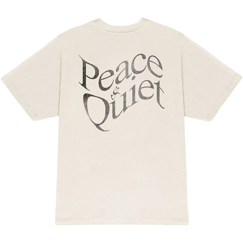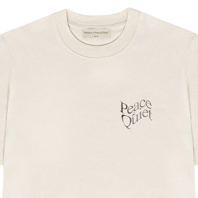 The Museum of Peace & Quiet Warped t-shirt in Bone is a high-quality t-shirt that features distressed, vintage looking Peace & Quiet Warped logos in Black on the front left chest and across the back of the shirt. 100% Cotton.