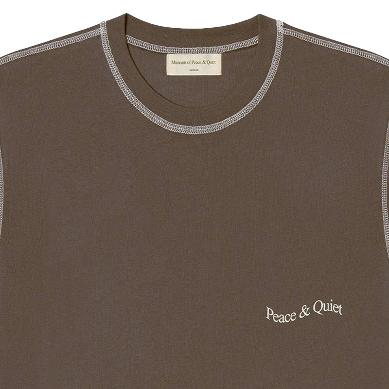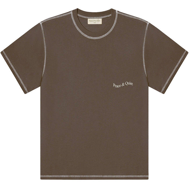 The Museum of Peace & Quiet Wordmark Reverse Stitched t-shirt in Brown is a high-quality custom t-shirt that features an embroidered Wordmark logo on the front of the shirt in White. It also features contrasting White overlock stitching throughout for a unique look. 100% Cotton.