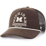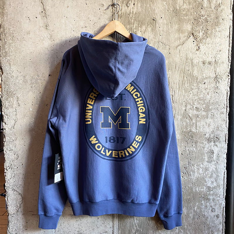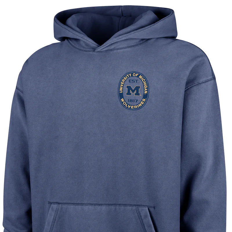 The University of Michigan Wolverines Booth Path Ravine Fleece hoodie in Portal Blue by '47 Brand is a high-quality heavyweight 400 gsm oversized hoodie that has a garment-dyed wash giving it a unique faded Blueish-Purple color throughout. It features vintage-inspired oval Block M graphics on the front left chest and across the back of the hoodie in Navy and Light Yellow. It also features a front kangaroo pocket, a '47 woven tag on the lower left hem, a modern darted hood, and a slightly oversized, drop-shoulder modern fit. 80% Cotton, 20% Polyester.