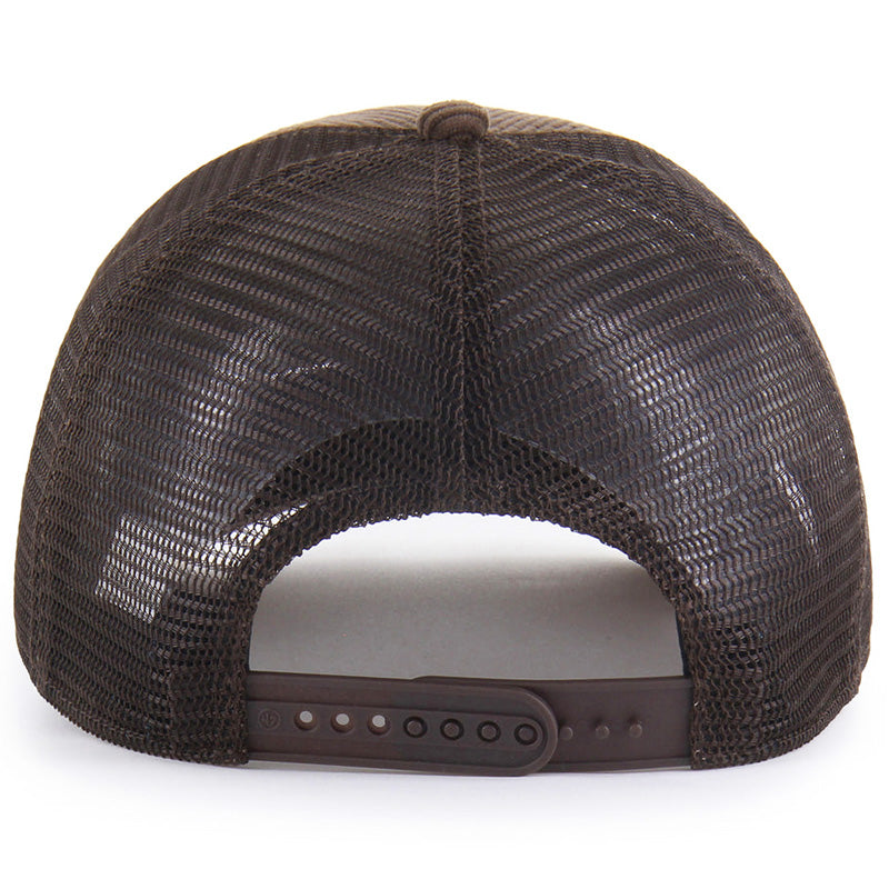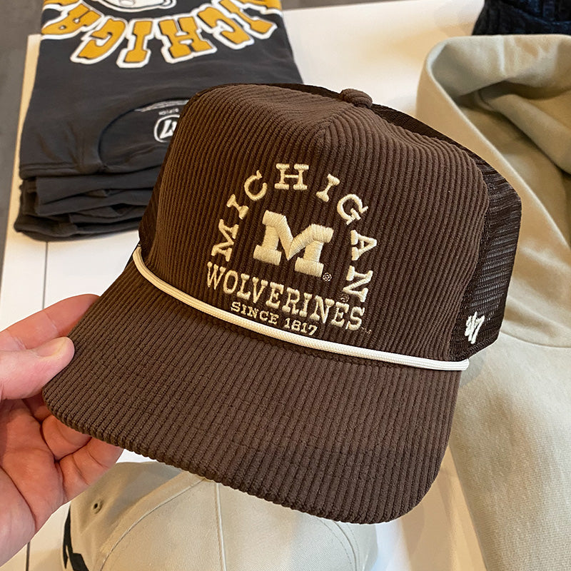 The University of Michigan Wolverines Ranchero Mesh Hitch hat in Brown from '47 is a high-quality unstructured hat with a curved brim that is made out of a unique Brown corduroy fabric. It features an embroidered Michigan Wolverines 'Ranchurro' western-inspired design on the front of the hat in Cream. It also features a Cream braided rope across the front of the hat, a small Cream '47 Brand logo embroidery on the left side of the hat, Brown mesh back panels, and an adjustable snapback closure in the back. 50% Cotton, 50% Polyester.