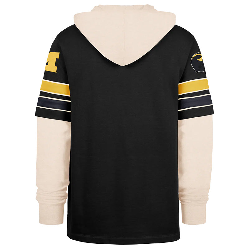 The University of Michigan Wolverines Split Zone Cornerback Duo Lacer hoodie in Flint Black by '47 Brand is a high-quality French Terry oversized hoodie in Black and Cream that is meant to look like you are wearing a jersey over a hoodie.  It features embroidered appliqué graphics throughout, including a large Block M logo on the front chest, and both a Wolverines football helmet logo and an additional Block M logo on the shoulders. The Maize and Blue striping on the arms is also made out of twill appliqué, and additional features include  a '47 woven jersey tag on the lower right hem, a front kangaroo pocket, and adjustable drawstrings on the hood.  Please note this item runs oversized and long; we suggest sizing down one size from your normal size unless you prefer a longer fit. 100% Cotton.