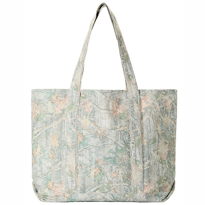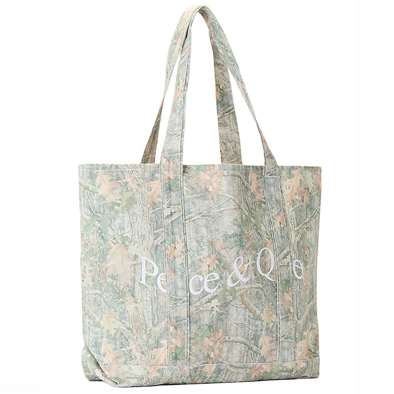 The Museum Of Peace & Quiet Wordmark Boat Tote Bag in Camouflage is a high-quality large Cotton canvas tote bag that features a large printed 'Peace & Quiet' wordmark logo across the front of the bag in White. It is made out of their seasonal faded realtree Camo patterned canvas. It also features a smaller outer pocket on the back side of the bag, a large main interior compartment with a hidden inner pocket, an interior metal keyring for your keys, and a reinforced bottom. It measures approximately 21" wide x 15" tall x 2" depth. Canvas handles measure 24 inch long with a 10 inch drop. 100% Cotton canvas.