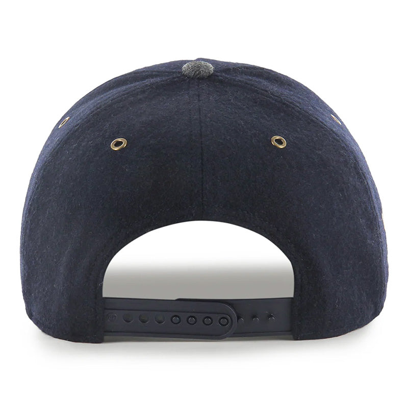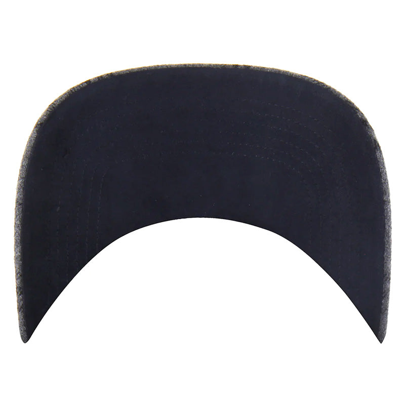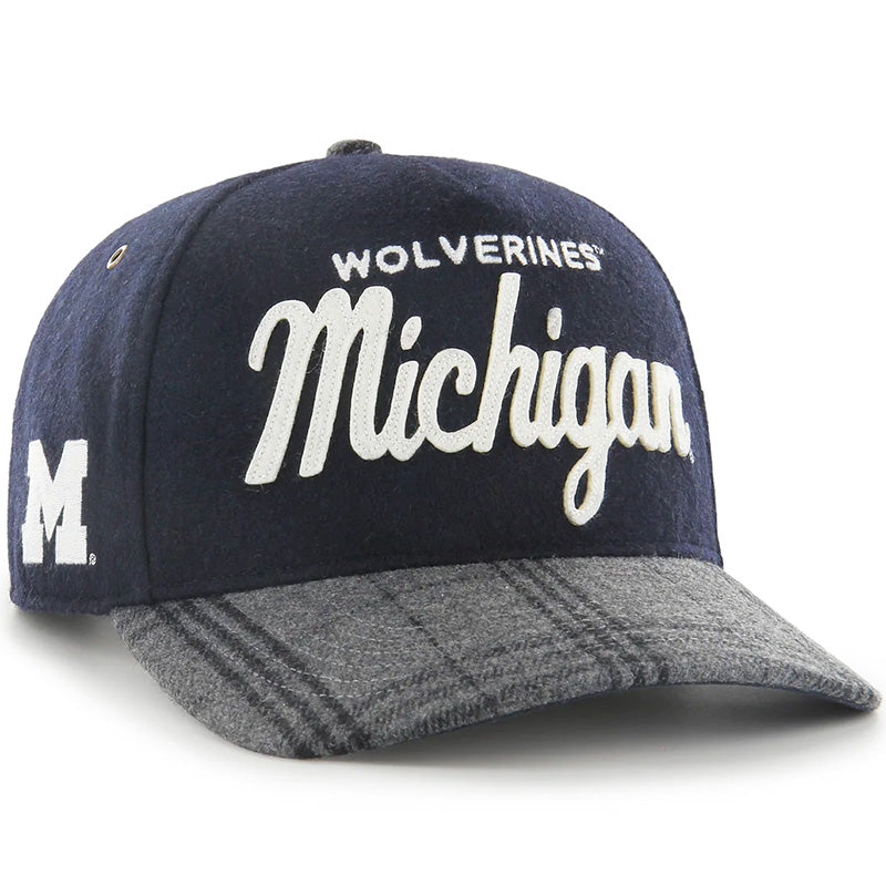 The University of Michigan Wolverines Windowpane Plaid Hitch RF hat in Navy from '47 is a high-quality soft-structured hat with a curved brim that is made out of a seasonal heavyweight Wool blend fabric. It features a large felt tackle twill appliqué Michigan script on the front of the hat, a Block M logo embroidery on the side of the hat, and a Grey and Navy striped wool plaid fabric on the brim. It also features antiqued brass metal eyelets, a Navy ultra suede under-brim, a small White '47 Brand logo embroidery on the left side of the hat, and an adjustable snapback closure in the back. 50% Wool, 50% Polyester.