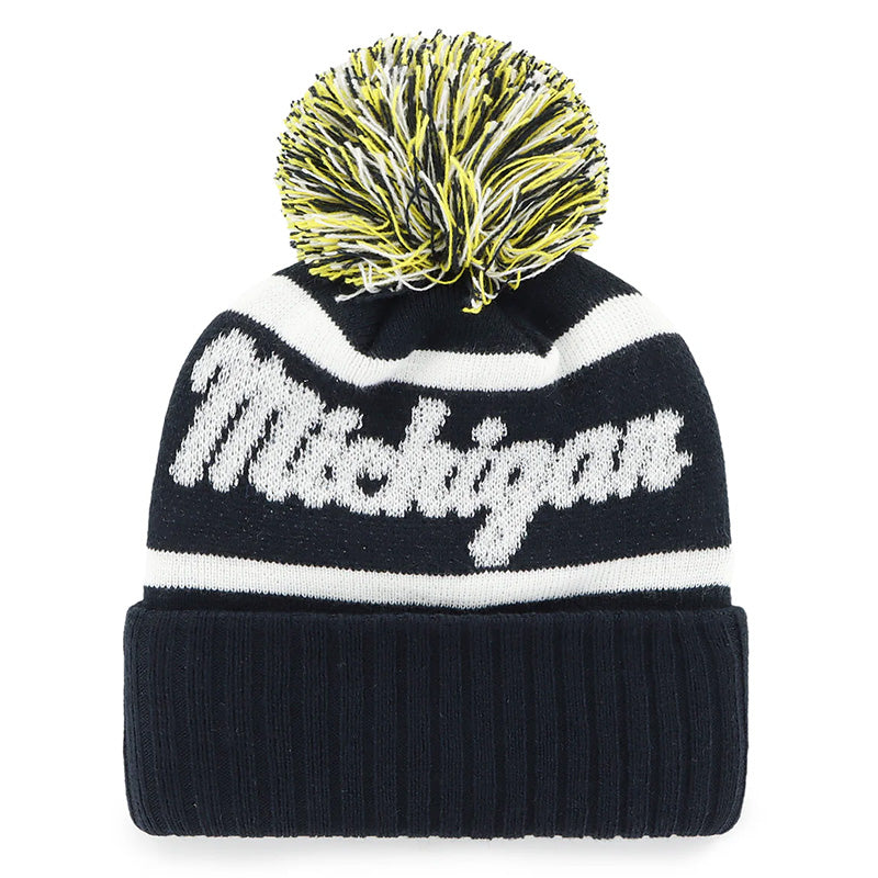 The University of Michigan Wolverines Women's Spirited cuff knit hat beanie in Navy from '47 is a high-quality knit beanie with a large Michigan script design on the crown of the beanie in Metallic Silver and White. It also features an oversized pom at the top of the hat, an embroidered Michigan Block M logo in Maize on the front ribbed cuff of the hat, and a tiny '47 woven logo tag on the left side of the cuff. 100% Acrylic.
