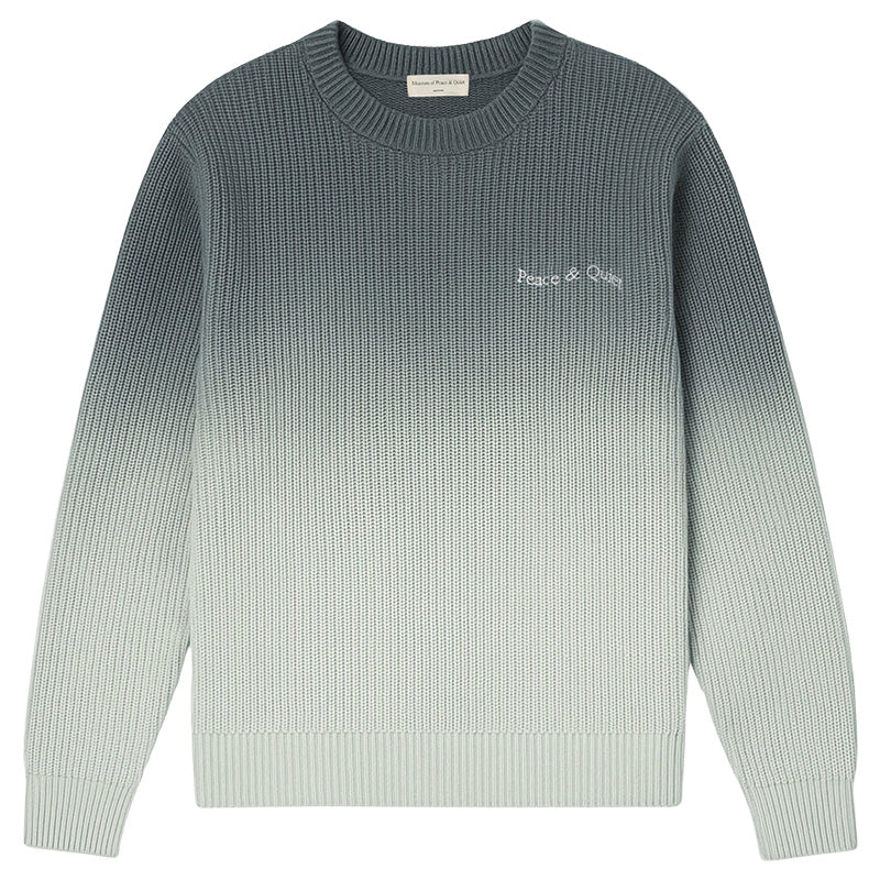 The Museum of Peace & Quiet Wordmark Gradient Knit sweater in Slate is a high-quality heavyweight 7-Gauge knit sweater that features an embroidered 'Peace & Quiet' Wordmark logo on the left chest in Grey. It also features a gradient fade throughout from a Dark Slate Grey to a Light Grey, as well as a ribbed collar, bottom hem and cuffs. 60% Cotton, 40% Acrylic.