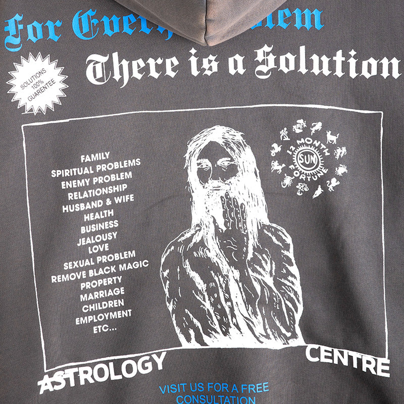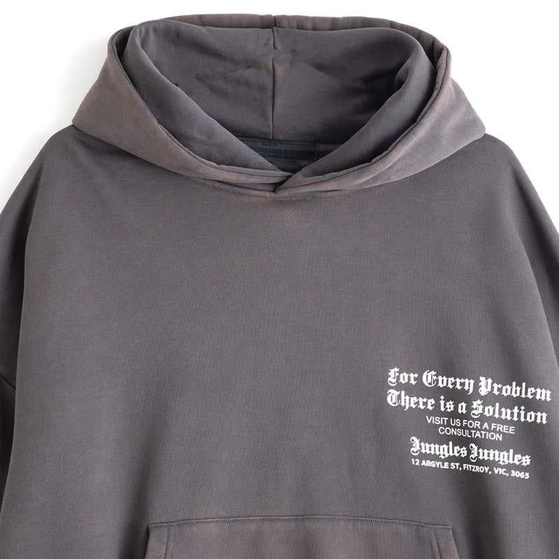 The Jungles Jungles Solutions hoodie in Vintage Grey is a high quality custom heavyweight 400 GSM hoodie with a heavily washed finish for a vintage, faded and worn-in look. It features 'For Every Problem, There Is A Solution' graphics on the front left chest and across the back of the hoodie in White and Light Blue. It also features a front kangaroo pocket, and a boxy, drop shoulder fit with a shorter cropped length. We recommend getting one size bigger than your normal size if you are taller or do not prefer the cropped length. 80% Cotton, 20% Polyester.