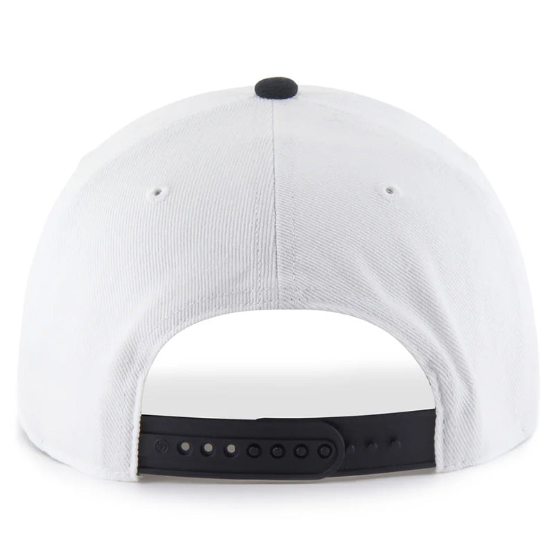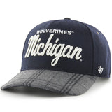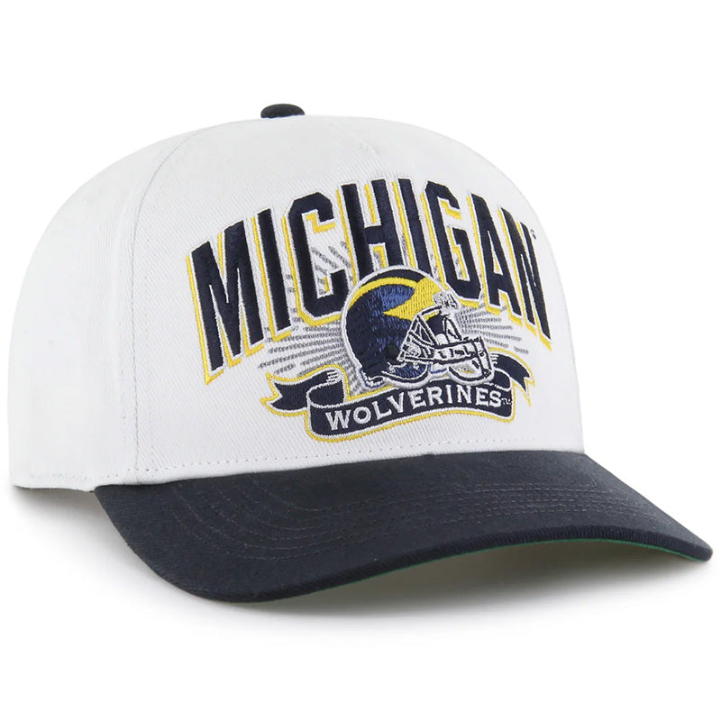 The University of Michigan Wolverines Prime Play Hitch hat in White from '47 is a high-quality soft-structured hat with a curved brim that is made out of a heavyweight cotton twill fabric. It features a large embroidered Michigan Wolverines 'Prime Play' arch and football helmet design on the front of the hat in Navy, Maize and White, along with a Navy brim and classic Kelly Green under-brim. It also features a small Navy '47 Brand logo embroidery on the left side of the hat, and an adjustable snapback closure in the back. 100% Cotton with Suede under-brim.