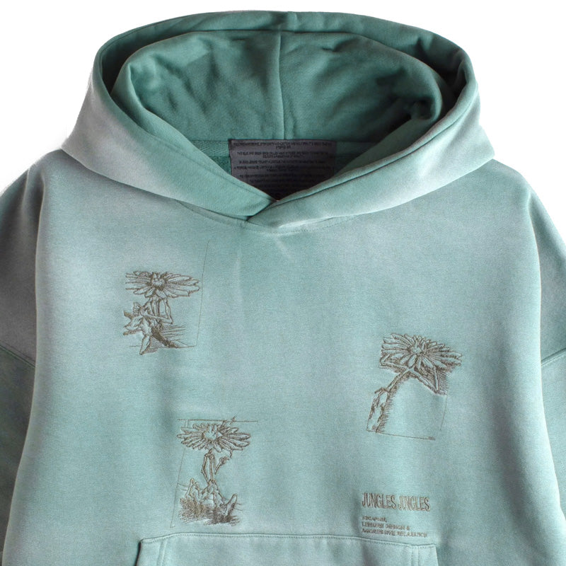 The Jungles Jungles Hard Times hoodie in Green is a high quality custom heavyweight 400 GSM hoodie with a heavily washed faded light Green finish for a vintage and sun faded worn-in look.  It features seasonal floral cartoon graphics embroidered on the front and left arm of the hoodie in Olive Green. It also features a front kangaroo pocket, and a boxy, drop shoulder fit with a shorter cropped length. We recommend getting one size bigger than your normal size if you are taller or do not prefer the cropped length. 80% Cotton, 20% Polyester.