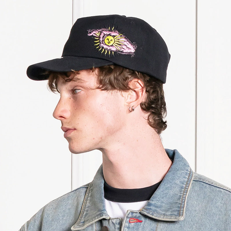 The PLEASURES Apollo hat in Black is a high quality semi-structured snapback hat that features two large embroidered Sun and hand graphics on the sides of the hat in Pink, Yellow and Black. On the front upper brim of the hat is a small White PLEASURES logo. It also features a curved brim and an adjustable snapback closure in the back of the hat. 100% Cotton.
