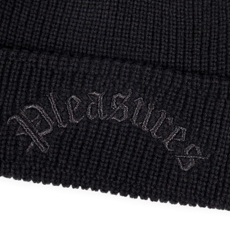 The PLEASURES Arch beanie in Black is a high-quality cuffed beanie that features an embroidered arched 'Old English' Pleasures logo on the front cuff in a dark Grey. 100% Acrylic.