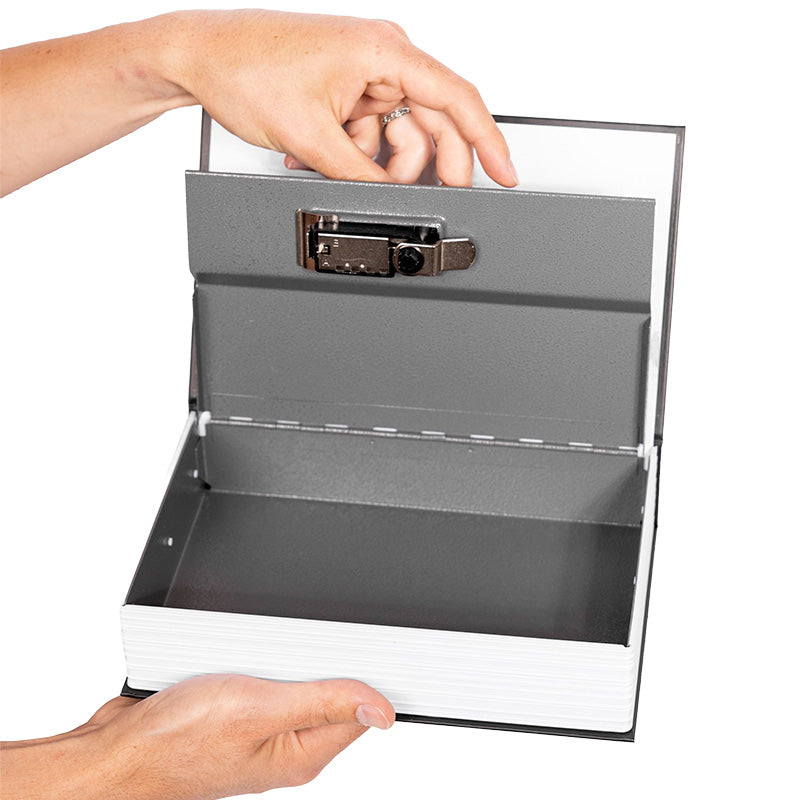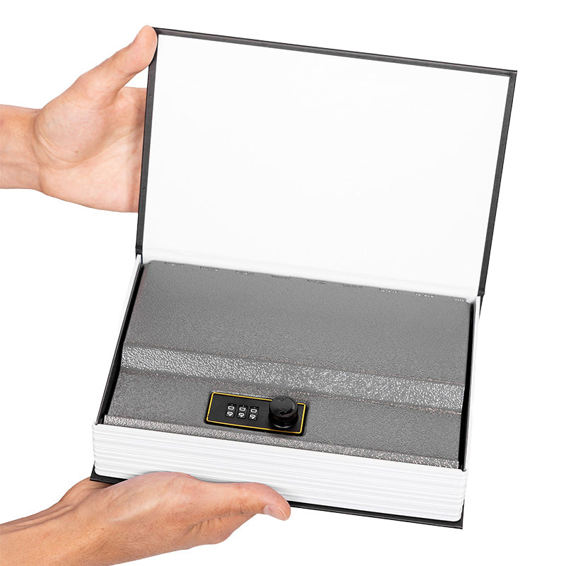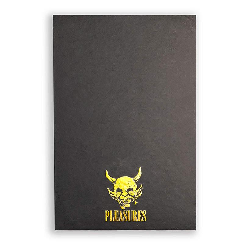 The PLEASURES Saint Booksafe in Black is meant to look like a bible (with a PLEASURES spin to it) but it is actually a faux book that contains a hidden metal compartment with a programmable combination lock on it so that you can stash your valuables or contraband inside. It features full color and metallic gold graphics on the front, back and spine of the "book" and measures approximately 9.5" high x 6" wide x 3" deep.