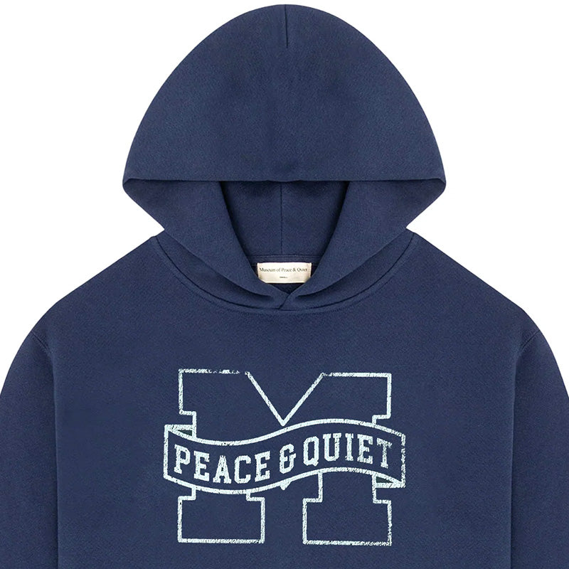The Museum of Peace & Quiet Banner hoodie in Navy is a high-quality, heavyweight, and super soft sweatshirt that features a distressed seasonal 'Banner' collegiate logo on the front chest in White. It is heavyweight but has a soft and lightweight feel due to the flush loopback construction of its Cotton two-end French Terry fleece. Additional features include a front kangaroo pouch pocket and a relaxed fit. 100% Cotton.