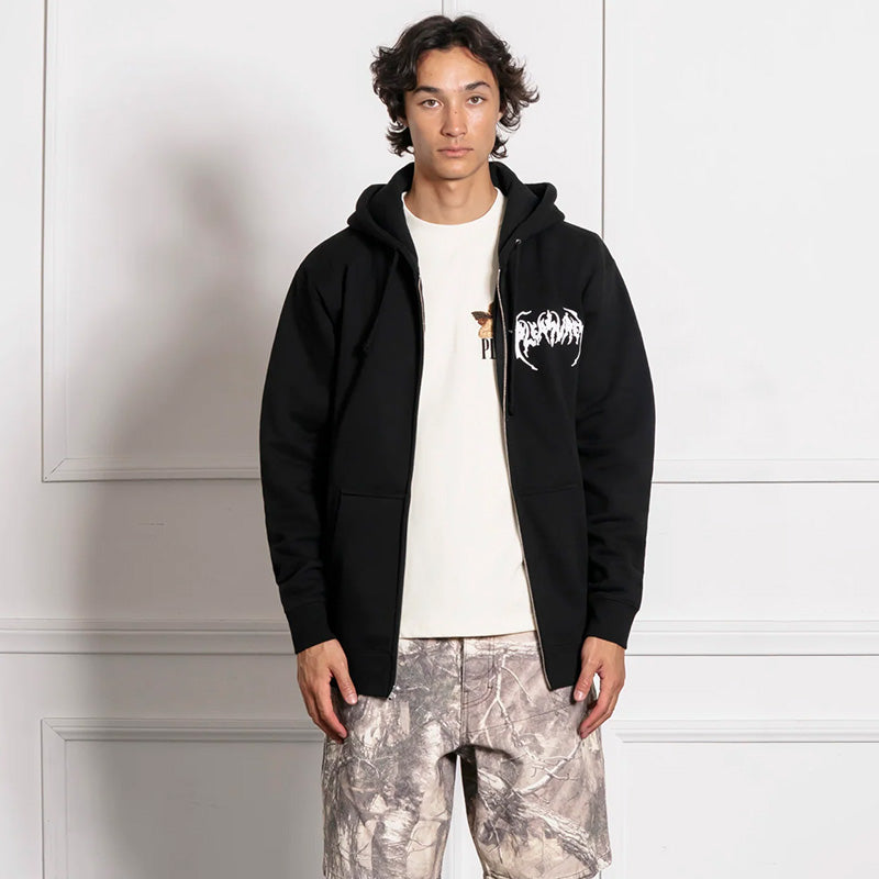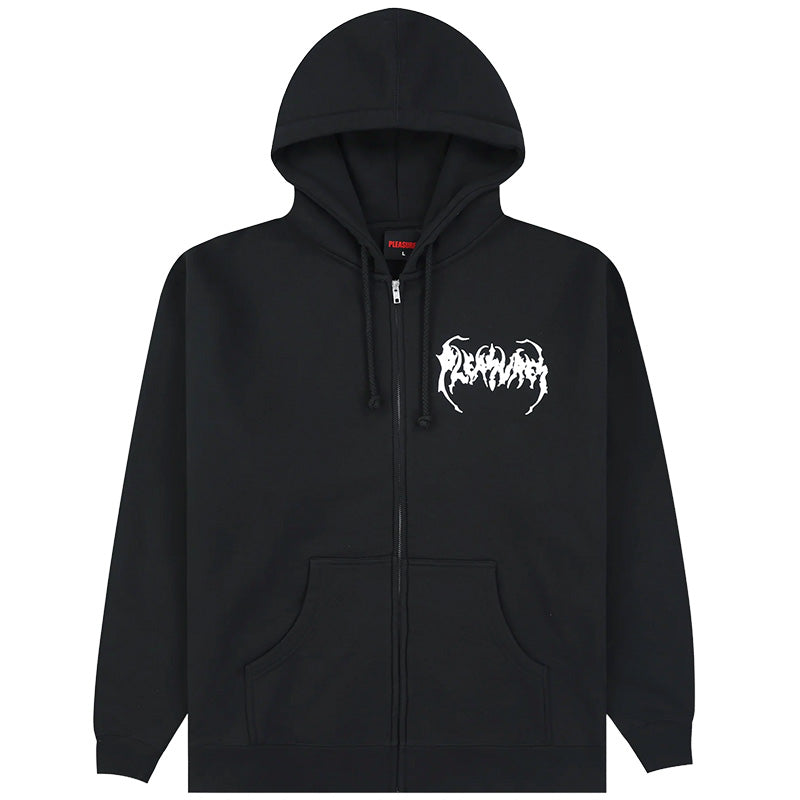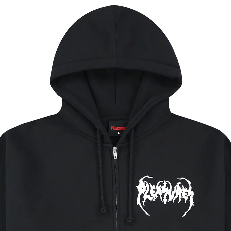 The PLEASURES Pond Zip hoodie in Black is a high-quality, heavyweight zip hoodie that features a large "PLEASURES Spirit Pond" waterfall and pond graphic across the back. On the front left chest is a seasonal PLEASURES graphic in White. It also features a front kangaroo pocket, and a relaxed, slightly oversized fit. 70% Cotton, 30% Polyester.