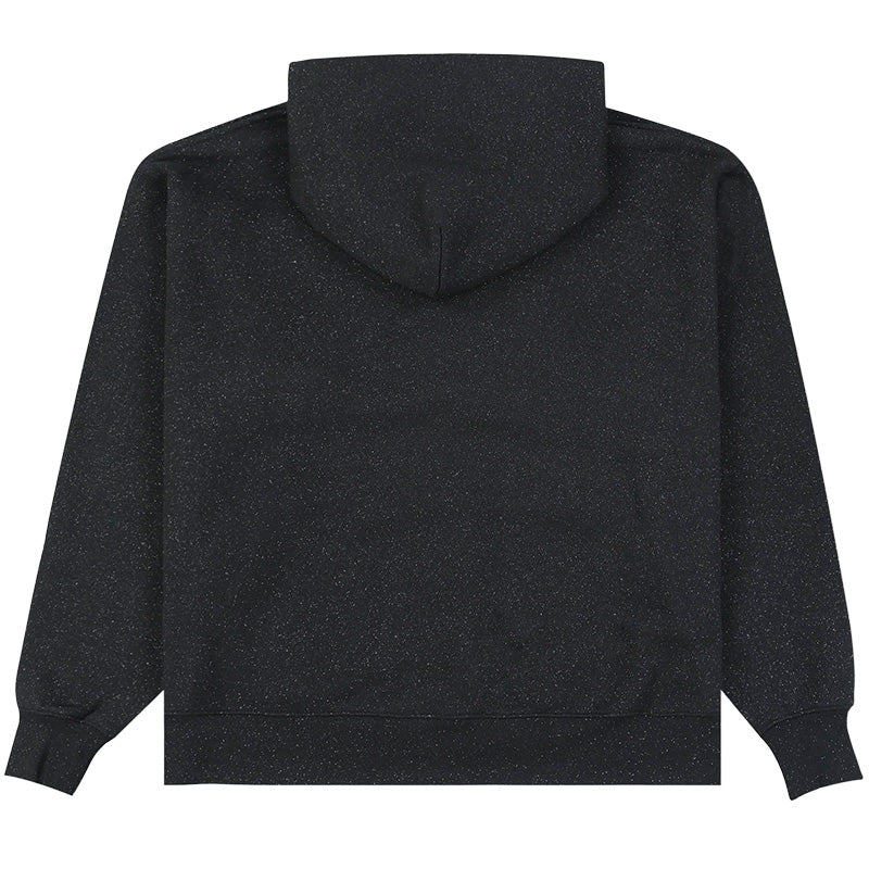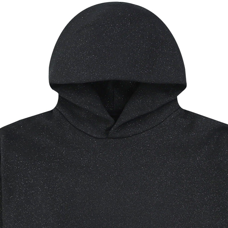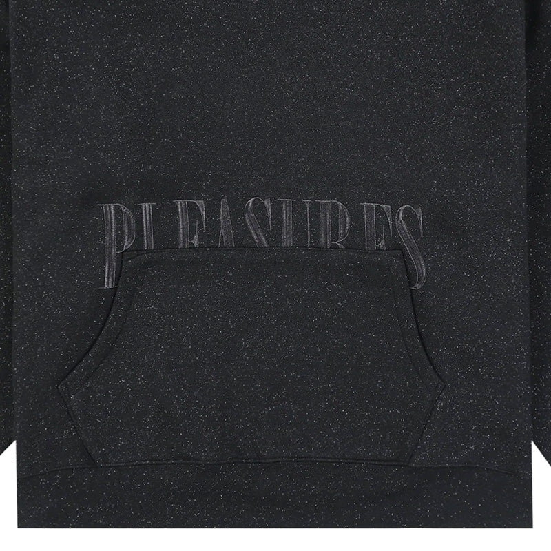 The PLEASURES Starry hoodie in Black is a high-quality, heavyweight 460 GSM custom hoodie that is made from a unique glitter fleece that shines, twinkles and reflects in the light. It features a large tonal Black PLEASURES logo embroidery behind and peeking out from the front kangaroo pocket, a modern hood, and a boxy, relaxed fit. 67% Cotton, 33% Polyester.
