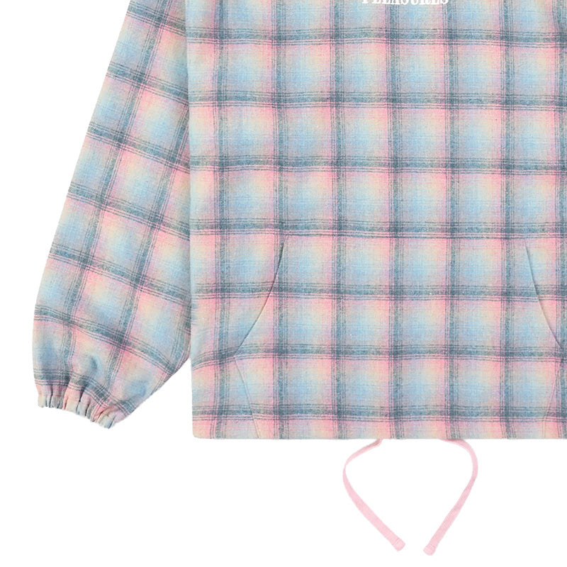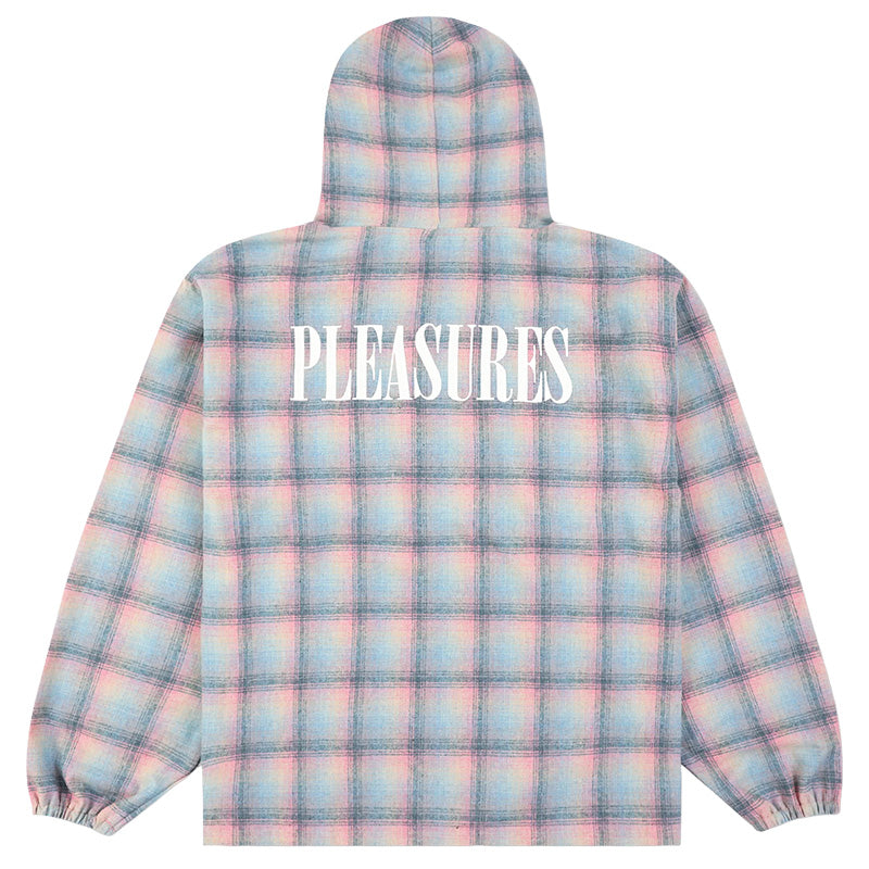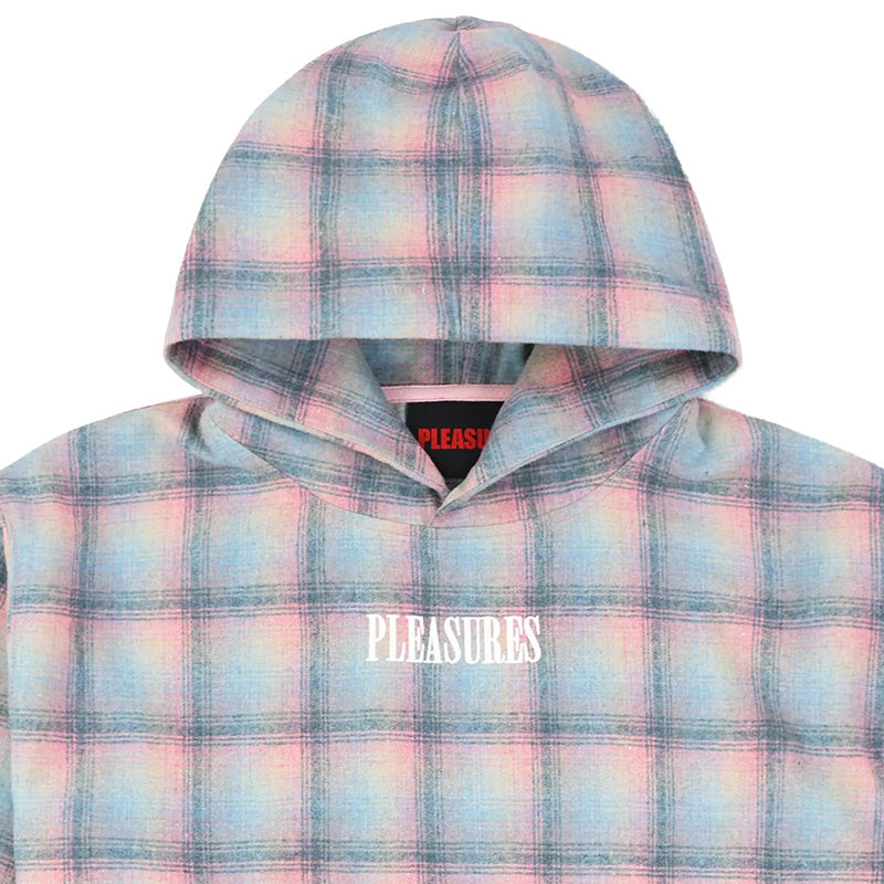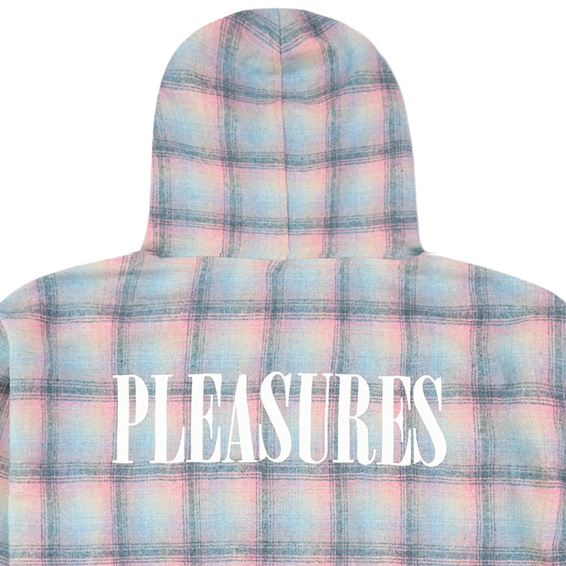 The PLEASURES Sender Poncho hoodie in Pink is a high quality custom wool flannel hoodie that features a unique Pink and Blue plaid pattern throughout. It is a cross between a flannel shirt and a hoodie and it features PLEASURES embroidery in White on both the front and back of the hoodie. It also features a front kangaroo pocket, an open bottom hem with an adjustable fabric drawstring, and a relaxed, boxy drop-shoulder fit with a slight crop to it. 100% Wool.
