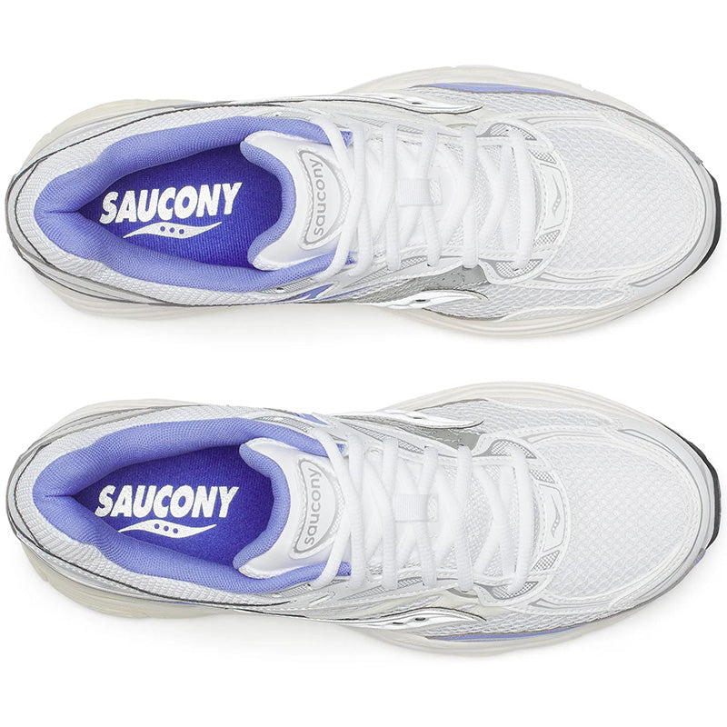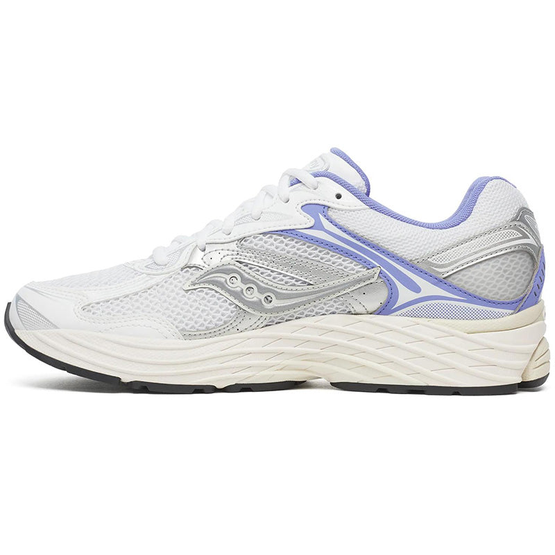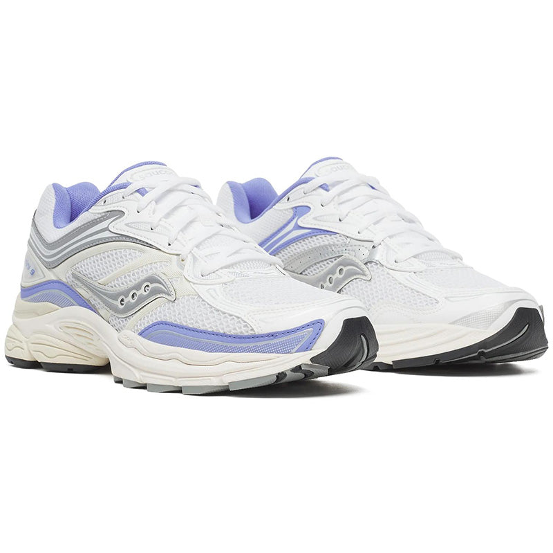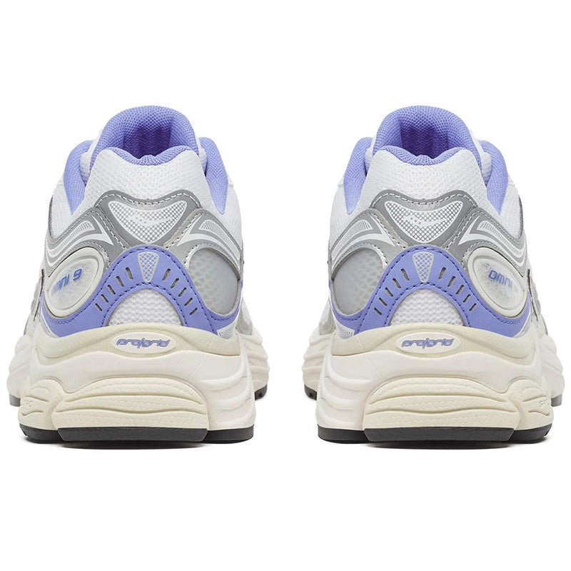 The Saucony Progrid Omni 9 'TMY' sneakers in White / Purple fuse retro tech with future materials and fabrication, giving them the nickname 'Tomorrow, Meet Yesterday'. The shoes feature White premium breathable open mesh construction, Lilac Purple and Silver reflective 3M accents, and Progrid technology on the Cream colored sole for superior cushioning and support. Nylon / Mesh Upper with Rubber Sole.