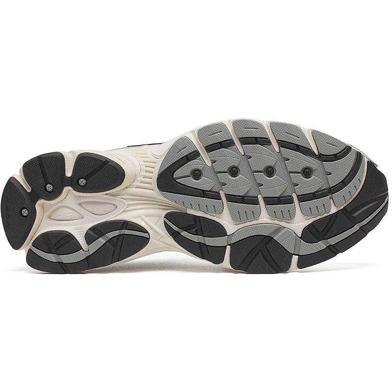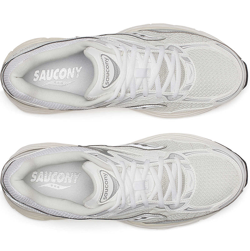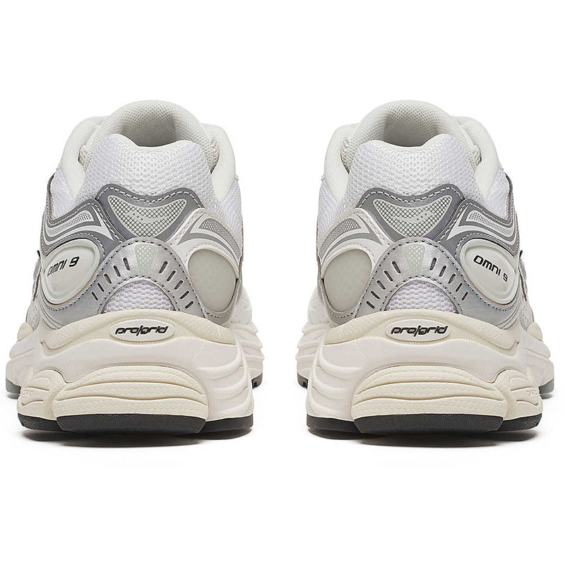 The Saucony Progrid Omni 9 'TMY' sneakers in White / Silver fuse retro tech with future materials and fabrication, giving them the nickname 'Tomorrow, Meet Yesterday'. The shoes feature White premium breathable open mesh construction, Silver reflective 3M accents, and Progrid technology on the Cream colored sole for superior cushioning and support. Nylon / Mesh Upper with Rubber Sole.