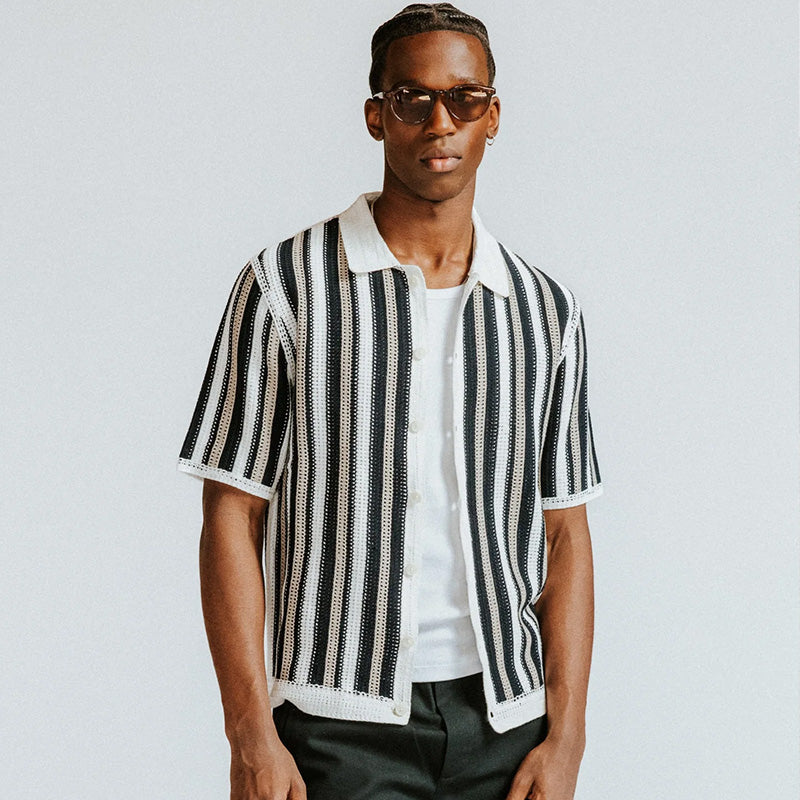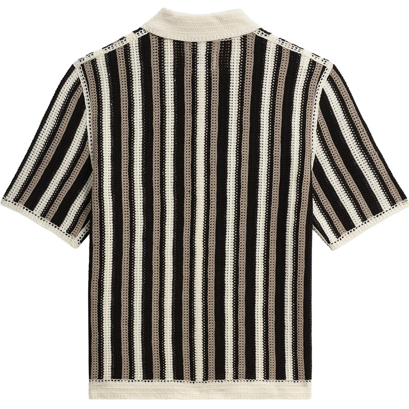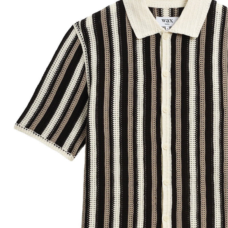 The Porto Strope Crochet Knitted shirt in Ecru / Black by Wax London is a relaxed fit short-sleeve button-up shirt with an open crochet knit construction. It features vertical Ecru, Stone and Black stripes and is made out of a breathable Cotton blend fabric with a unique knit texture. It also features a button-through placket, a straight bottom hem, and can be worn open or closed. 51% Cotton, 49% Acrylic.