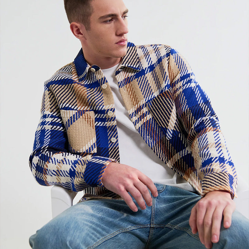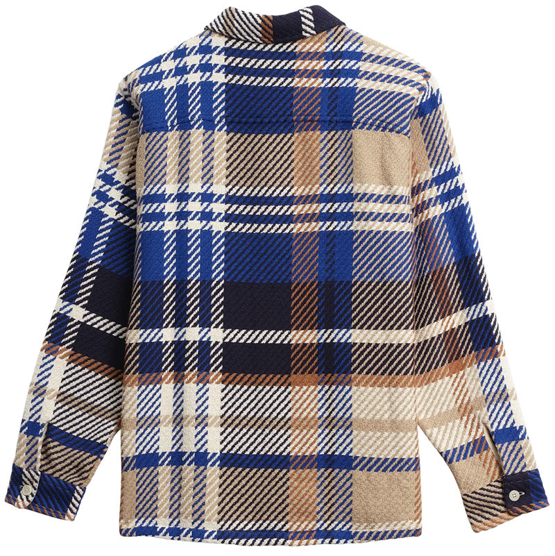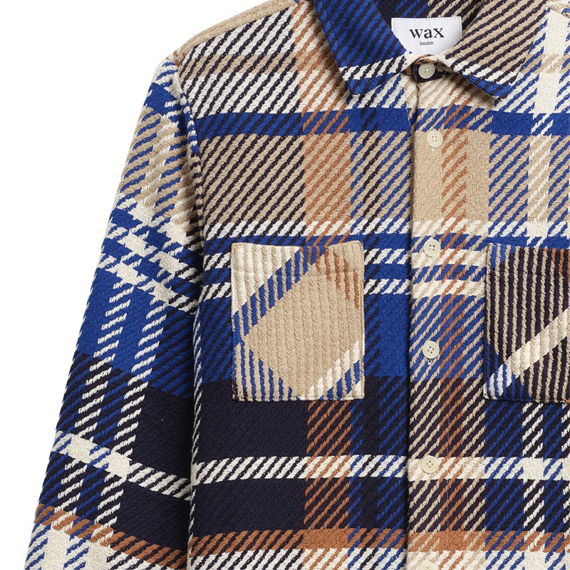 The Wax London Whiting Bold Check Overshirt in Blue / Tan is a very high-quality overshirt that features a new unique Blue, Tan and White large checkered pattern throughout. It is woven from a custom fabric made sustainably by a family-run French mill using recycled Cotton and the upmost craftsmanship. It features two front chest pockets, sustainably made Corozo nut buttons, and a slightly oversized over shirt fit. The Whiting Overshirt is Wax London's signature piece and it can be worn year round as a mid-layer, over-shirt, or light jacket. Each piece is unique due to the pattern placement of the fabric. 89% Recycled Cotton, 10% Polyester, 1% Other Fabrics.