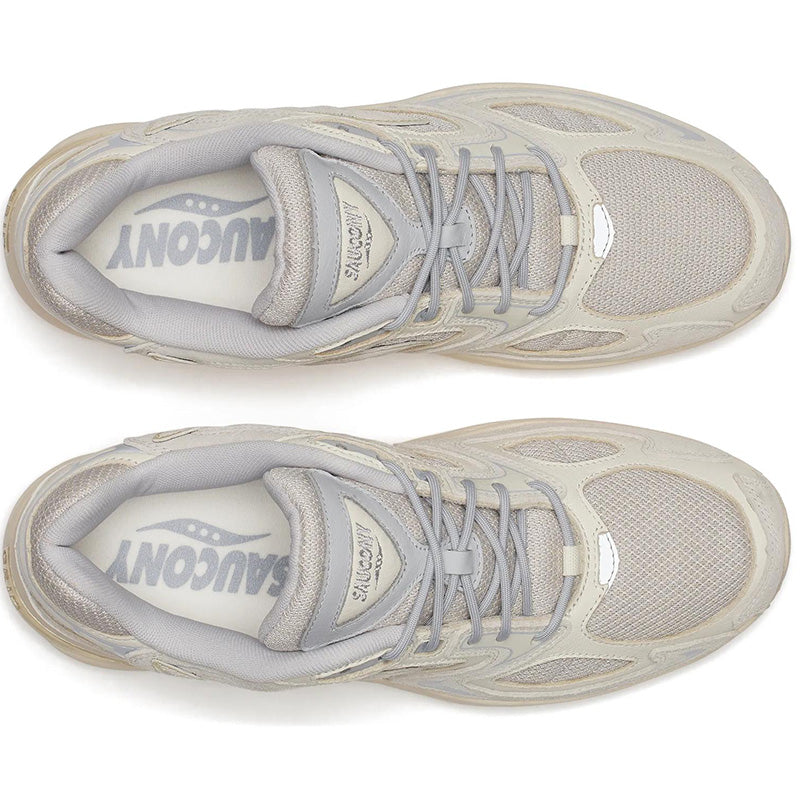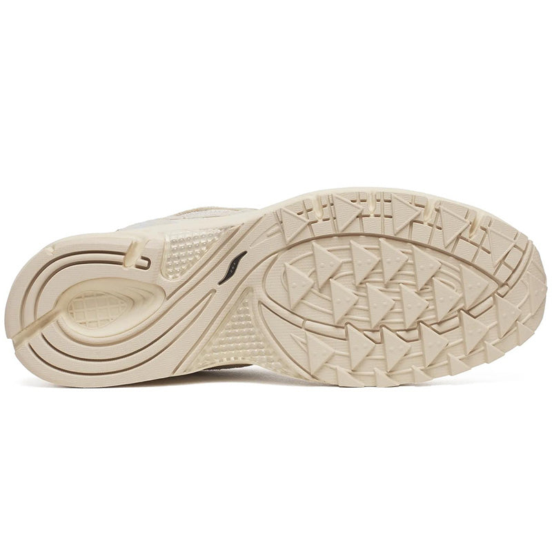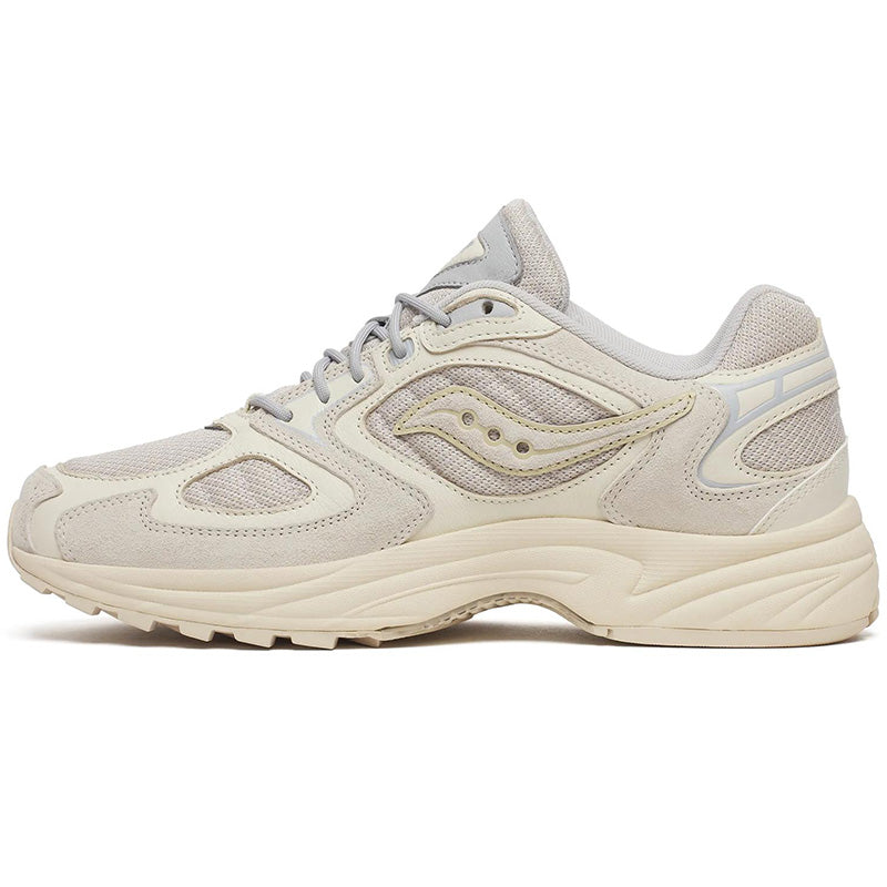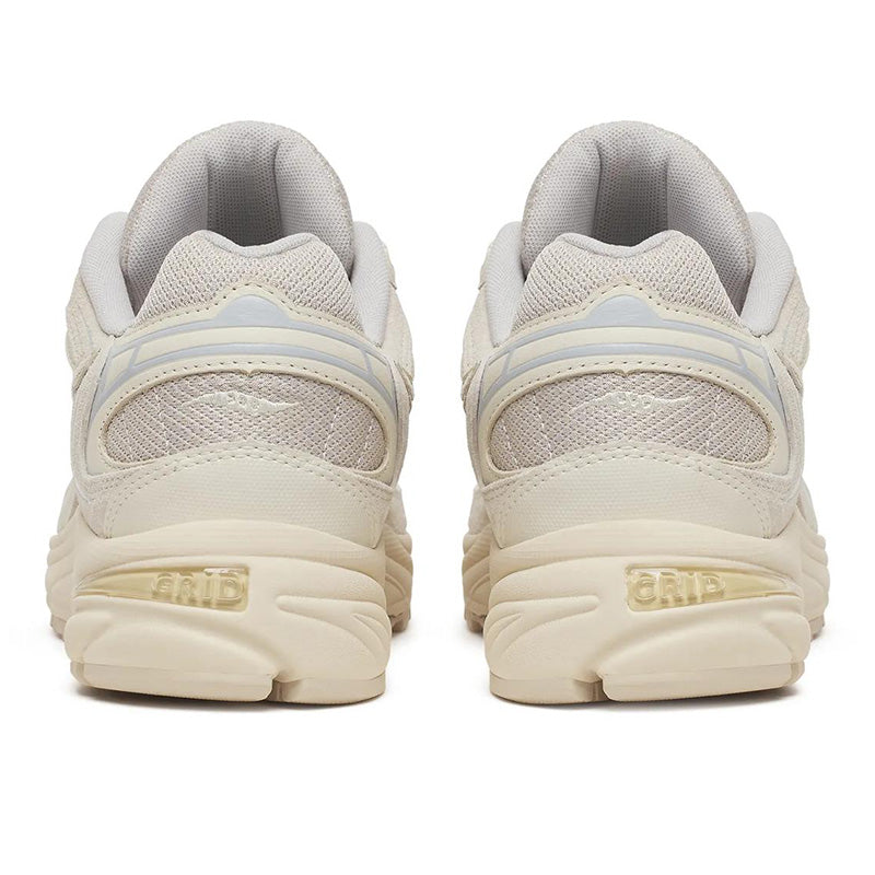 The Saucony Grid Jazz 9 Premium Suede sneakers in Cream / Ghost feature a tonal Cream and Grey upper that is made out of a breathable mesh and leather. The Grid Jazz 9 model fuses retro-inspired style with advanced modern performance technology for a perfect blend of style, functionality, and comfort. This shoe features a premium construction, upgraded nylon rope laces, 3M reflective accents, and Grid technology on the Cream colored sole for superior cushioning and support. Nylon / Leather / Mesh Upper with Rubber Sole.