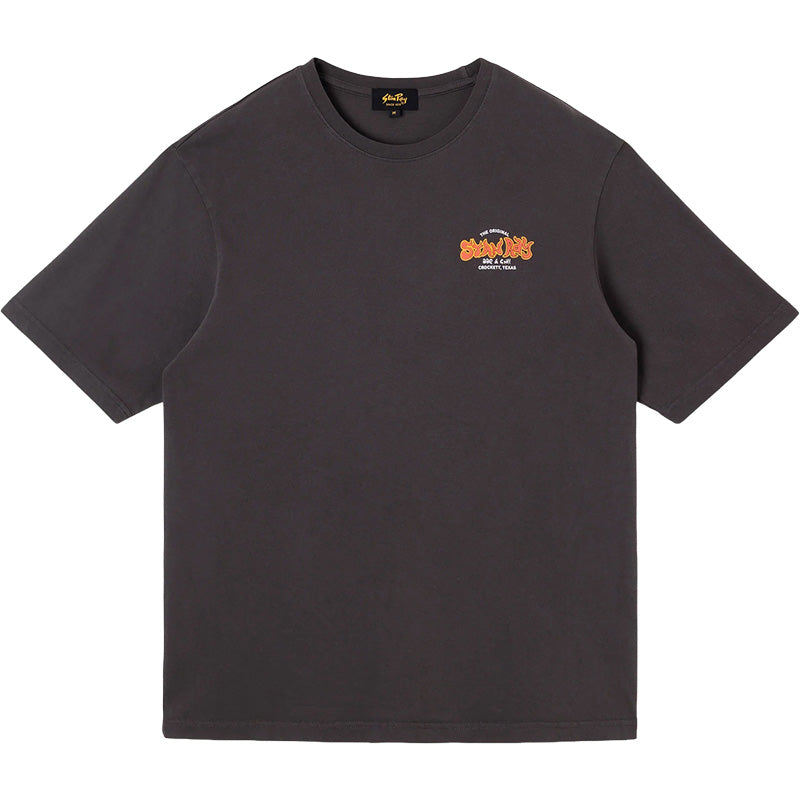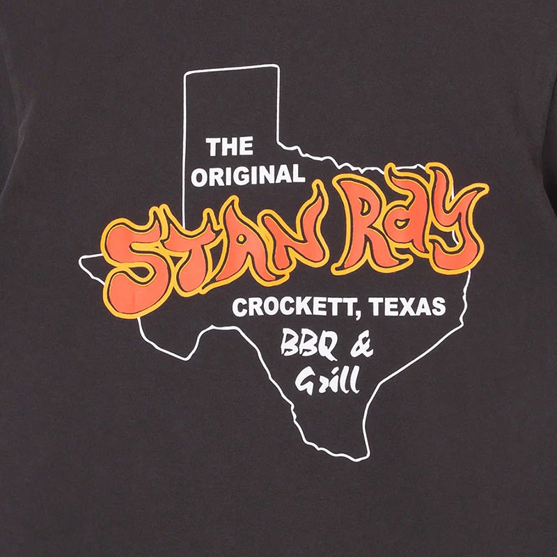 The BBQ t-shirt in Raven Black from Stan Ray is a heavyweight 230 GSM t-shirt with a faded Black pigment dyed washed finish. It features Texas barbecue graphics on the front left chest and back of the shirt in Orange, Yellow and White. 100% Cotton.