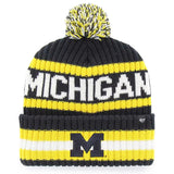 The University of Michigan Wolverines Wave Rope Option Hitch hat in Natural from '47 is a high-quality structured hat with a curved brim that is made out of a garment-washed cotton twill fabric. It features a large Natural and Dark Tan colored Michigan Wave design on the front of the hat, a small '47 Brand logo embroidery on the left side, a Dark Tan snapback closure in the back, and a Dark Tan underbrim. This hat is part of a special limited edition neutral-tone release of hats by '47. 100% Cotton.