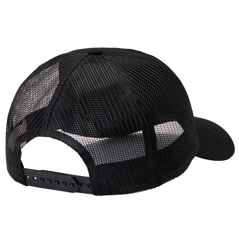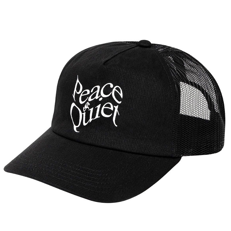 The Museum Of Peace & Quiet Warped Trucker Hat in Black is a high-quality unstructured trucker hat with a large 'Peace & Quiet' warped logo in White on the front of the hat. It also features classic mesh back panels, a lower profile fit, a curved brim, and an adjustable snapback closure in the back. 60% Polyester, 40% Cotton.