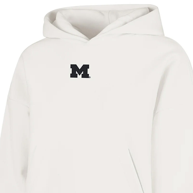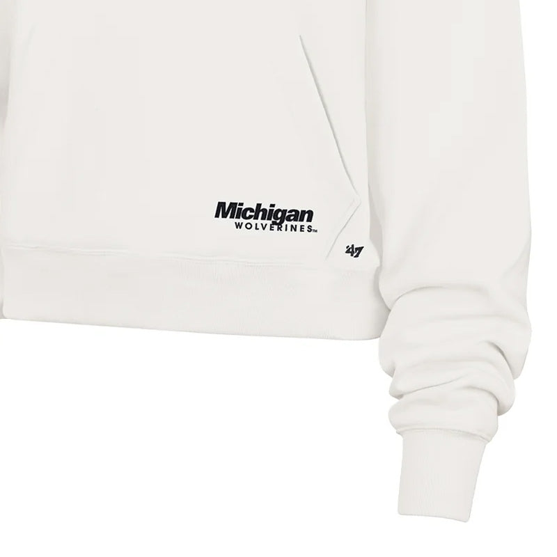 The University of Michigan Wolverines Women's Sue Foundation hoodie in Sandstone by '47 Brand is a high-quality heavyweight 400 gsm slightly-cropped Women's fit hoodie that is made out of their reverse weave Tanker fleece, which prevents shrinkage and stretching. It features a small embroidered Michigan Wolverines Block M graphic below the neckline in Navy, along with an embroidered 'Michigan Wolverines' seasonal text on the lower left part of the front kangaroo pocket. It also features an over dyed finish to give the hoodie a washed vintage look, an embroidered '47 logo on the left side of the kangaroo pocket, a modern darted hood, and a slightly oversized, drop shoulder fit in the body. 80% Cotton, 20% Polyester.