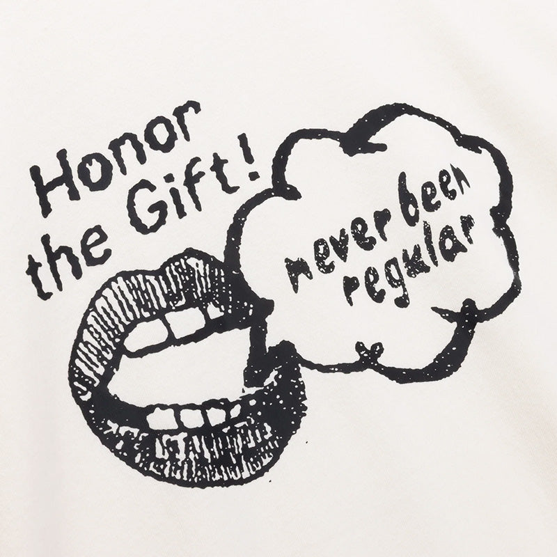 The Honor The Gift Never Been Regular t-shirt in White is a high-quality heavyweight custom tee with a seasonal distressed 'Never Been Regular' speaking drawn graphic in Black on the front of the shirt. The fit on this shirt is a slightly oversized, boxy fit. 100% Cotton.