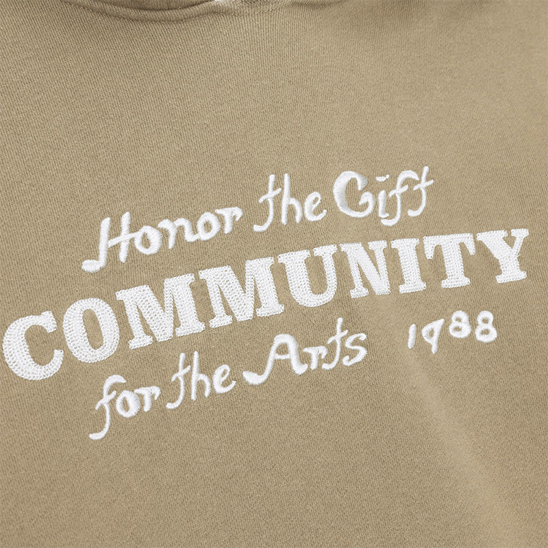 The Honor The Gift Vintage hoodie in Pebble is a high-quality heavyweight premium French Terry sweatshirt that features a vintage wash treatment throughout for a faded, washed look. It also features an embroidered seasonal 'Community For The Arts' graphic across the front chest, a front kangaroo pocket, a slightly cropped raw-edge finish at the bottom hem, and raw-edge finished open cuffs at the sleeves. The fit on this hoodie is a slightly oversized fit. 100% Cotton.