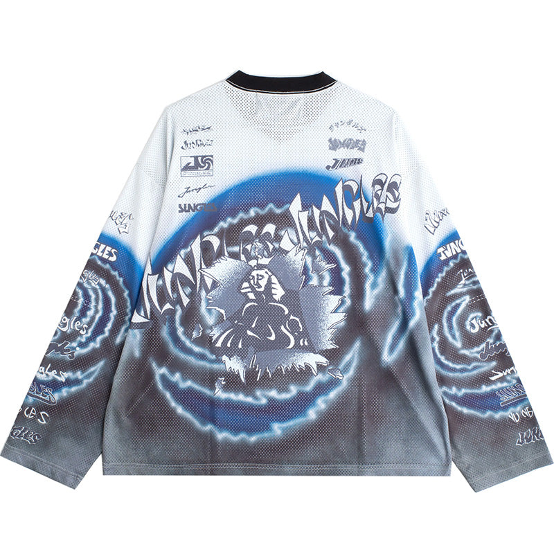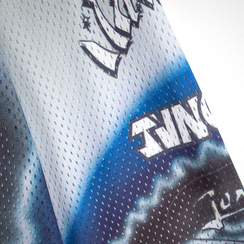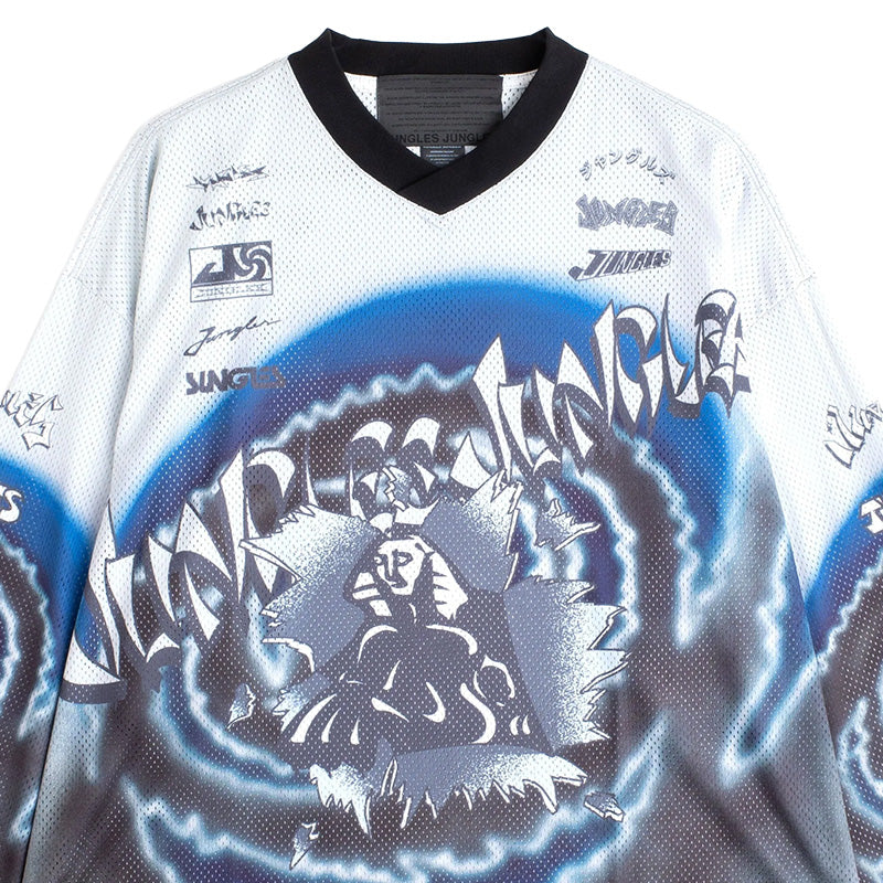 The Jungles Jungles Moto Jersey in Multi is a long sleeve sports mesh jersey that features an allover print of various archival Jungles logos in Black, Grey, White and Blue. It also features a contrasting Black v-neck collar and a shorter cropped body length. We recommend getting one size bigger than your normal size if you are taller or do not prefer the cropped length. 100% Polyester.