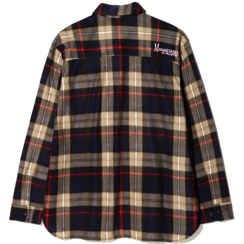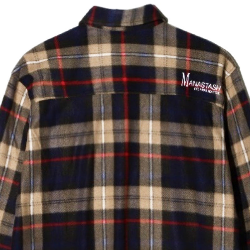 The Manastash Fleece Plaid CPO shirt in Navy is a high-quality polar fleece overshirt with a Navy, Tan and Red plaid pattern throughout. It features two front chest pockets, an embroidered Triple Mountain logo on the left chest pocket, an embroidered Manastash logo on the back right shoulder, and a button-up closure. This item is meant to be an overshirt and fits oversized. 100% Polyester with 80% Polyester / 20% Cotton trim and lining.