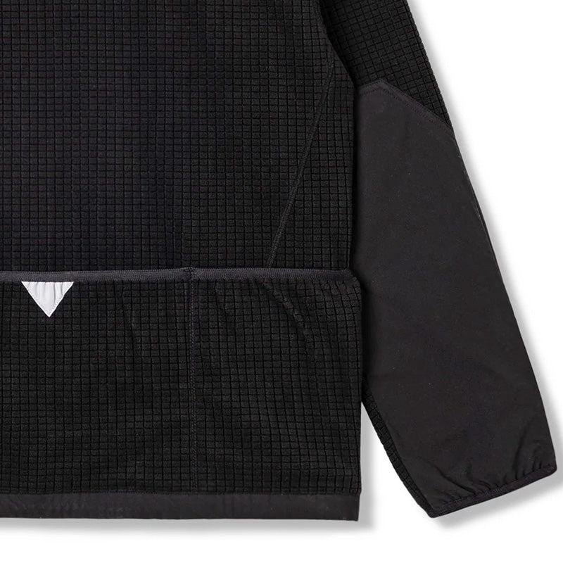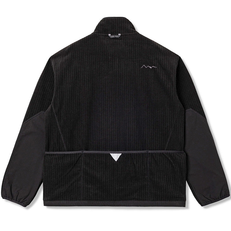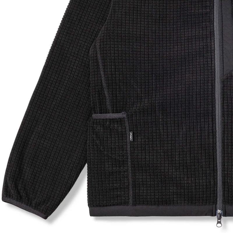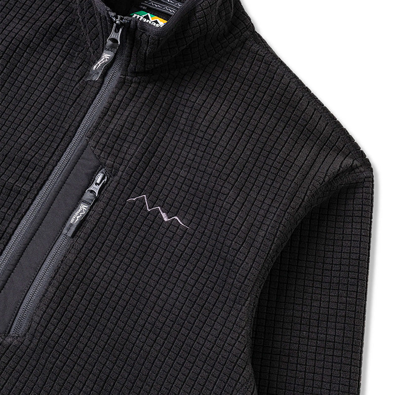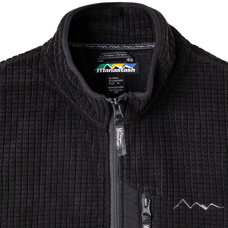 The Manastash Grid Fleece Zip jacket in Black is a high-quality lightweight jacket that is made out of a unique Polyester fleece fabric with a textured square grid pattern allover it. It features tonal Black embroidered Manastash mountain logos on the left chest and right back shoulder, a hidden zippered pocket on the left chest, side and back utility pockets, reinforced Nylon forearms, and a triangular 3M reflective patch on the back of the jacket. 100% Polyester.