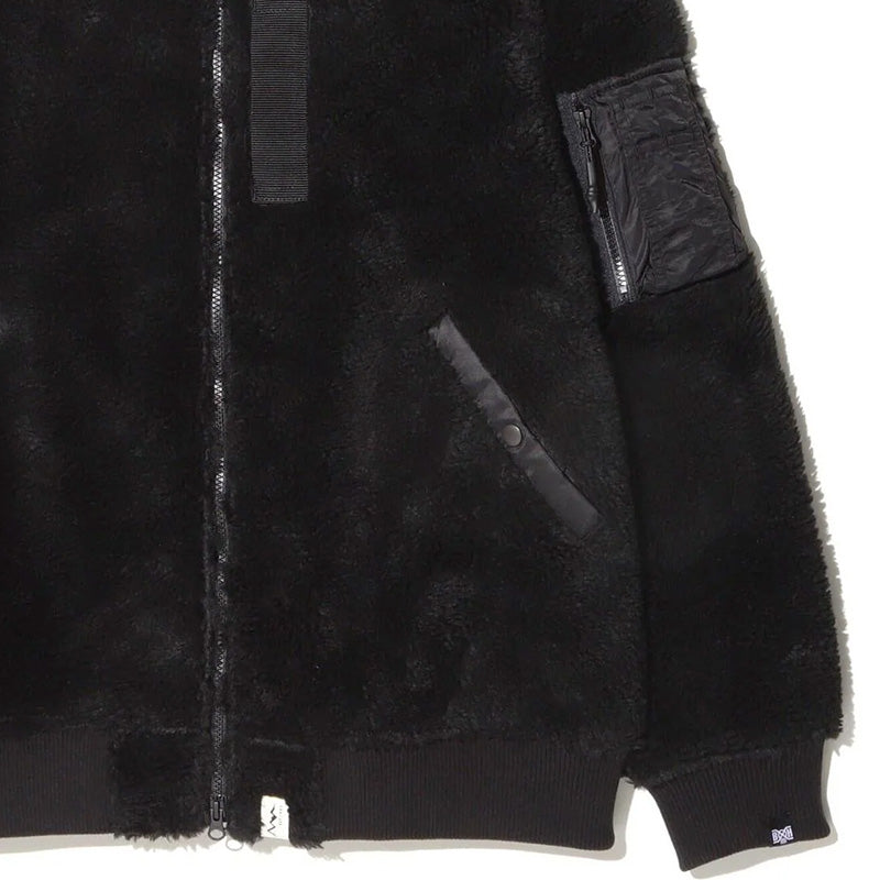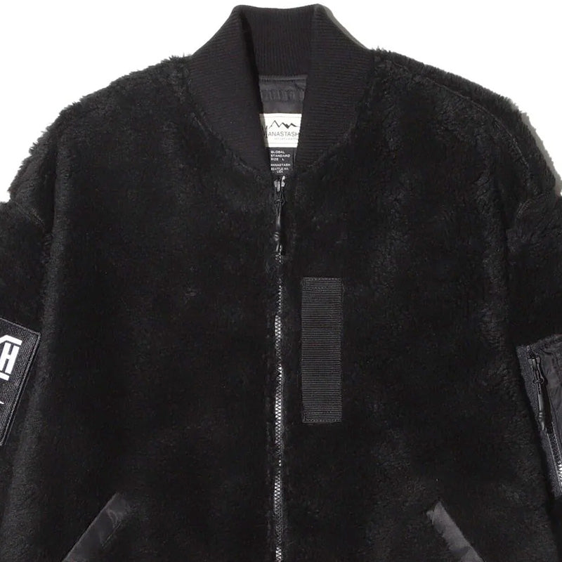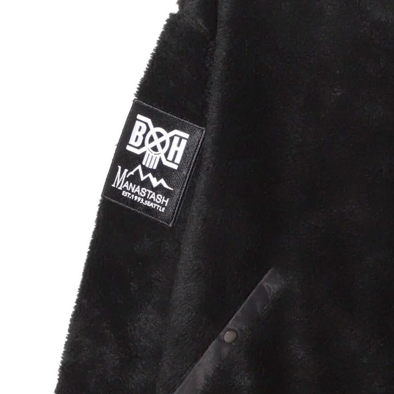 The Manastash x Bounty Hunter BOA MA-1 jacket in Black is a limited collaboration item with the Tokyo, Japan-based toy and clothing brand, Bounty Hunter. It is a classic MA-1 flight bomber jacket that has been reappropriated and made out of a super-soft thick sherpa fabric. It features an embroidered removable velcro Bounty Hunter and Manastash logo patch on the right arm, a classic flight jacket Nylon pocket on the left arm, two front hand pockets, a zipper closure, a contrasting Red lining, and various Bounty Hunter and Manastash woven tags throughout. 100% Polyester.