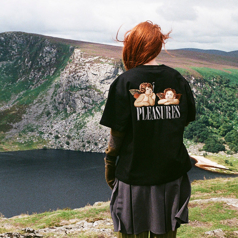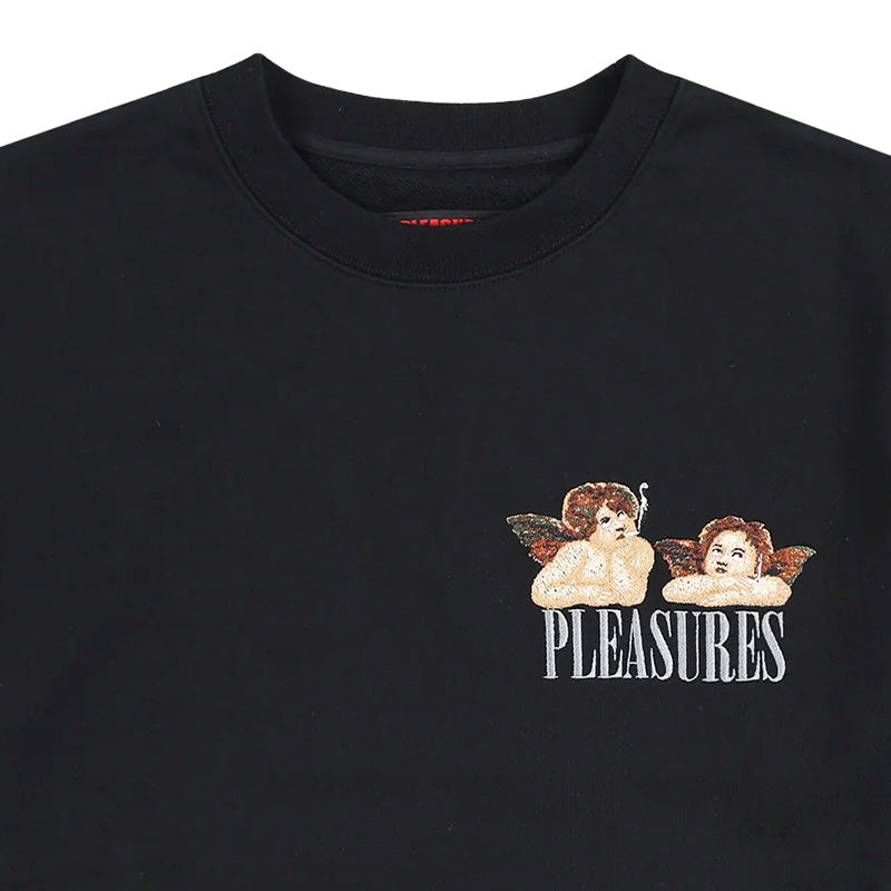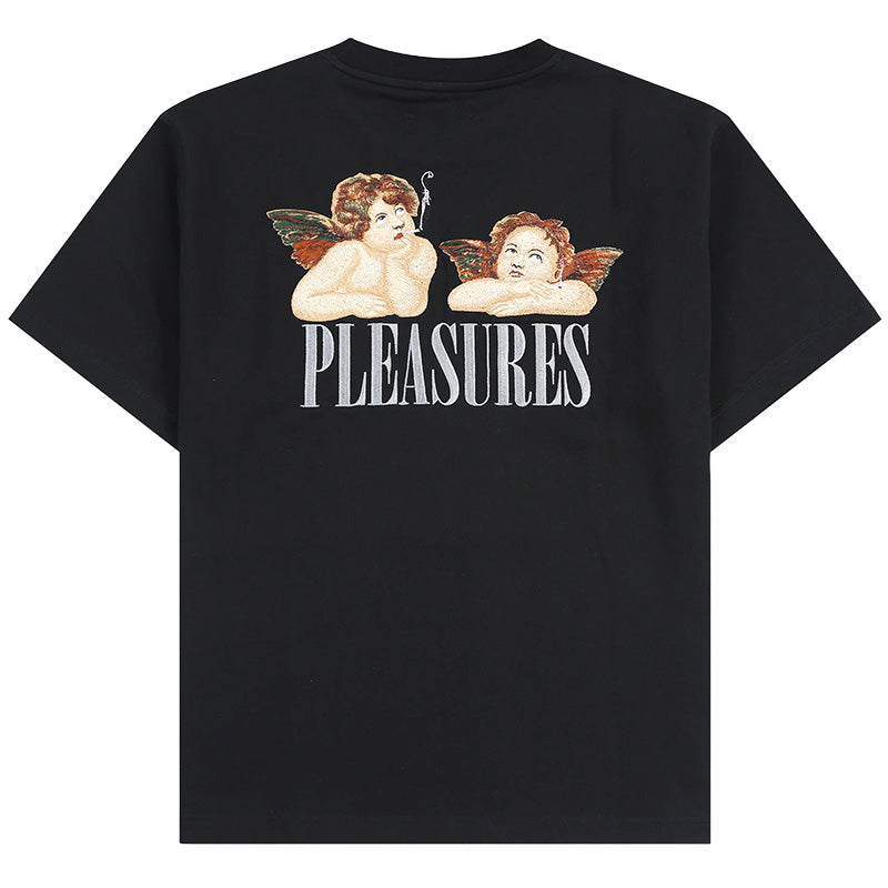 The PLEASURES Dynamic Short Sleeve Crewneck in Black is a super-heavyweight high quality t-shirt that is made out of 400 GSM French Terry fleece fabric, which is usually what their heavyweight sweatshirts are made out of. It features intricately embroidered graphics of angels smoking on the front left chest and large across the back of the shirt. It also features a slightly oversized, boxy fit. 90% Cotton, 10% Polyester.