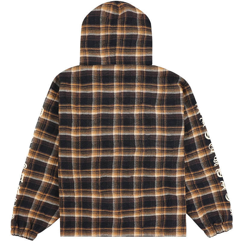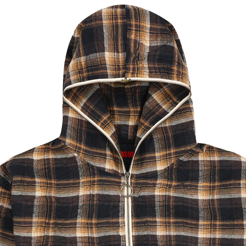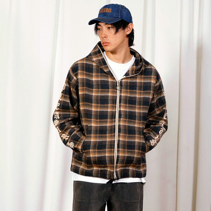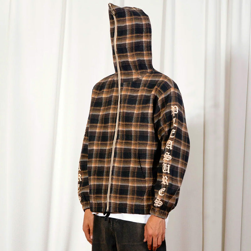 The PLEASURES Groove Zip Poncho hoodie in Brown Plaid is a high-quality plaid hoodie that features embroidered PLEASURES Old English lettering down each sleeve in Cream. It also features a contrasting White full zip closure, a front kangaroo pocket, an open bottom hem with an adjustable drawstring, and an oversized fit. 65% Polyester, 35% Cotton.