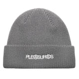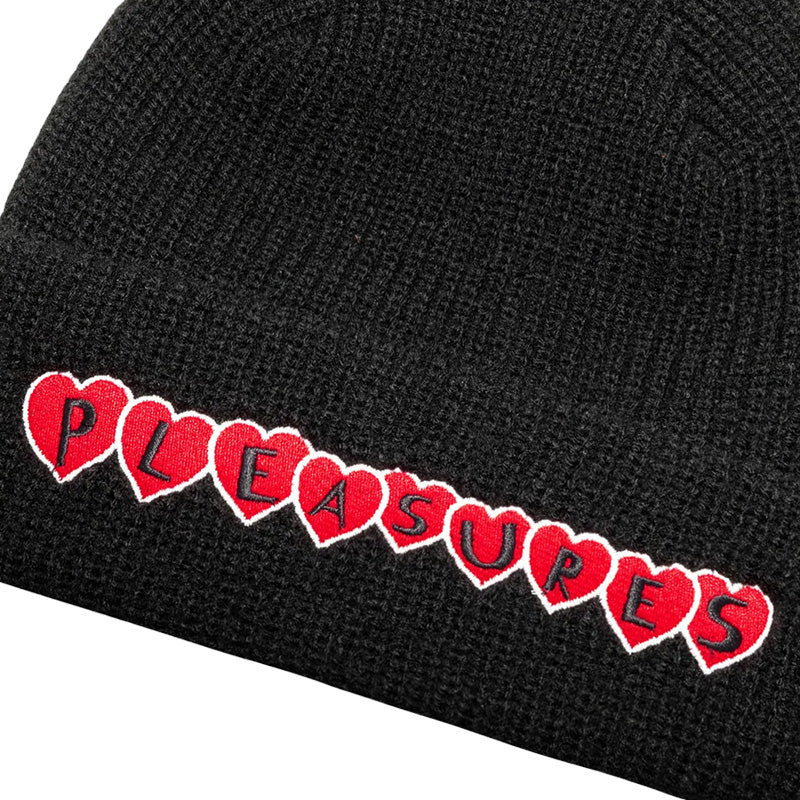 The PLEASURES Hearts beanie in Black is a high-quality cuffed beanie that features an embroidered Pleasures logo with hearts behind each letter on the front cuff in Red, White and Black. 100% Acrylic.