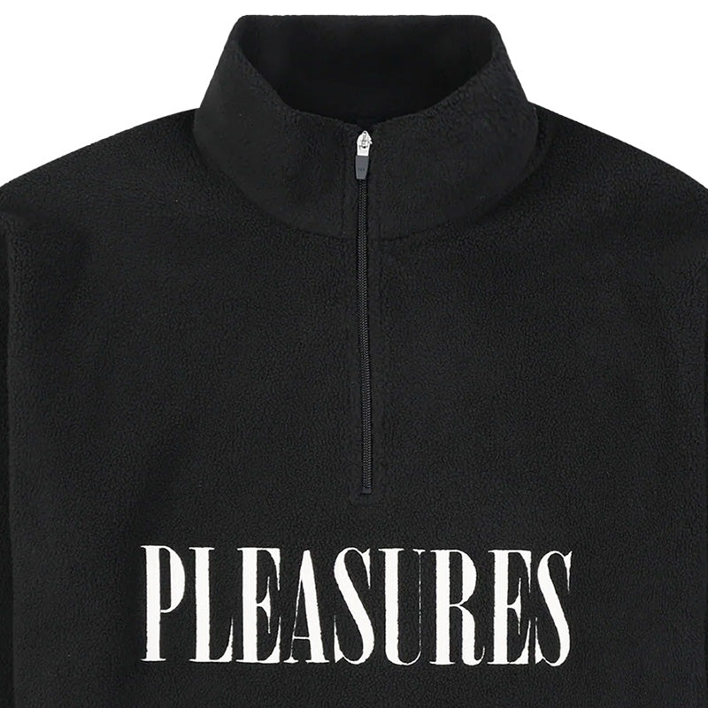 The PLEASURES Onyx Half Zip Polar Fleece in Black is a 330 GSM polar fleece half zip jacket/sweatshirt that features a large embroidered PLEASURES logo in White across the middle. It features a half-zip closure at the collar, an open bottom hem, and a relaxed overall fit. 64% Polyester, 36% Cotton.