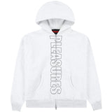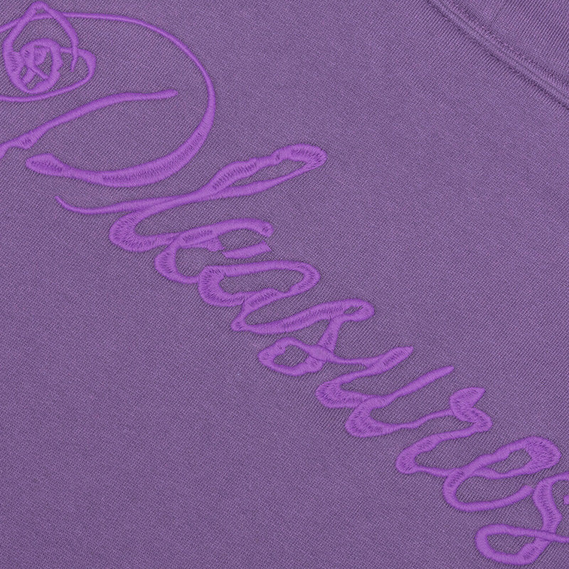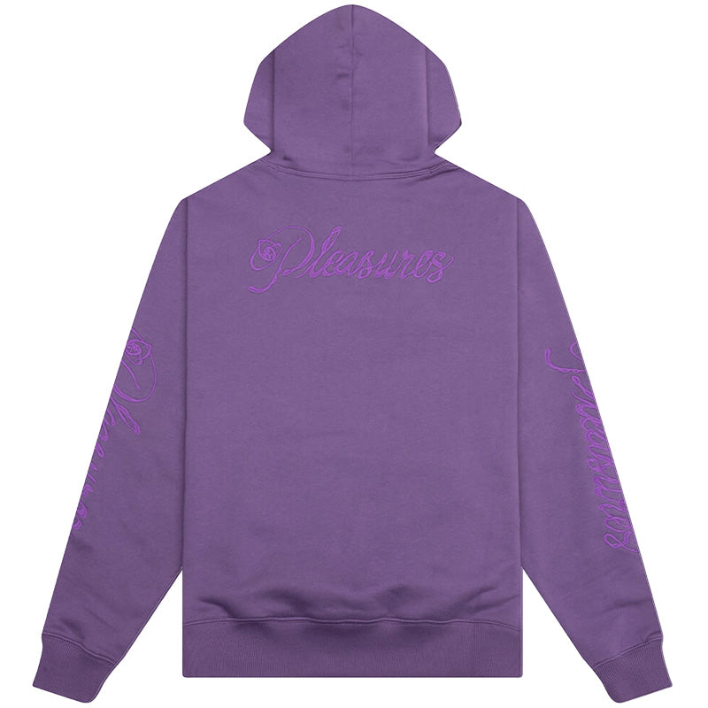 The PLEASURES Scrawl hoodie in Eggplant Purple is a heavyweight sweatshirt that features large embroidered tonal Purple PLEASURES scrawl graphics down each arm and across the back of the hoodie. It also features a front kangaroo pocket, and a relaxed, slightly oversized fit. 65% Cotton, 35% Polyester.
