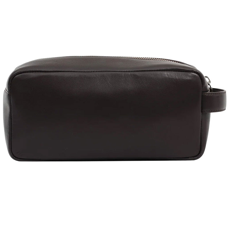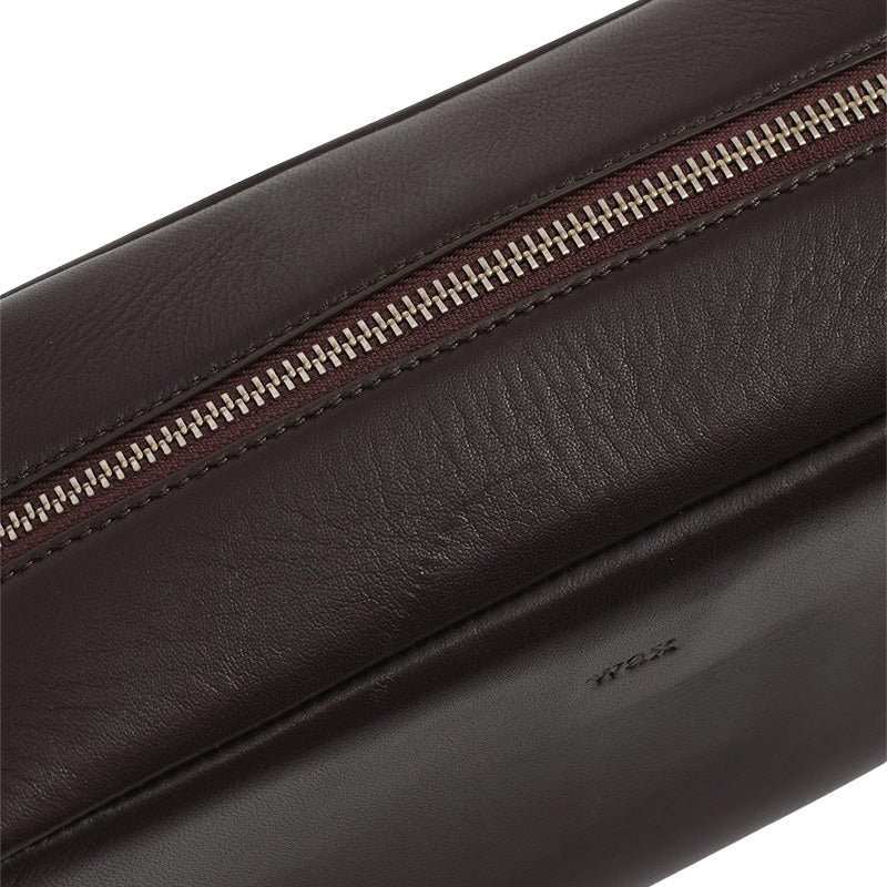 The Wax London Wells Grain Leather Wash Bag in Dark Brown is a high quality refined travel wash or toiletry bag that is made out of a super soft and smooth Dark Brown leather. It is large enough to hold all of your essentials and also has an easy-carry side handle on the on outside of the bag. It features a small embossed Wax logo on the front of the bag, a high quality zippered compartment with a leather zipper pull, and an internal zippered pocket with a branded Wax badge. It also features a Black cotton lining on the inside and can be easily wiped clean with a cloth. Measures approximately 9.5 inches long x 4.5 inches tall x 3.5 inches deep. 100% Leather Outer with Cotton lining.